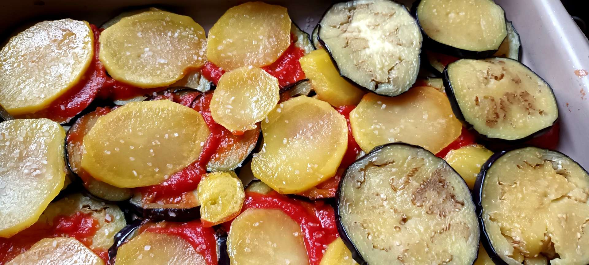 Seguimos con otra capa de patatas, otra de berenjenas y un poco de sal y, por último, cubrimos con tomate frito.