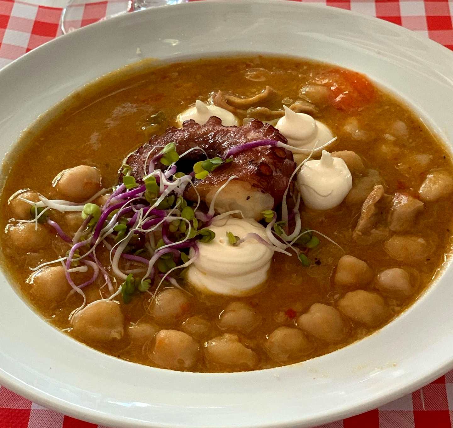 Un rico guiso de garbanzos de la cosecha de Cortijo de jara con pulpo y crema de curry, un plato riquísimo que realizó Monka.