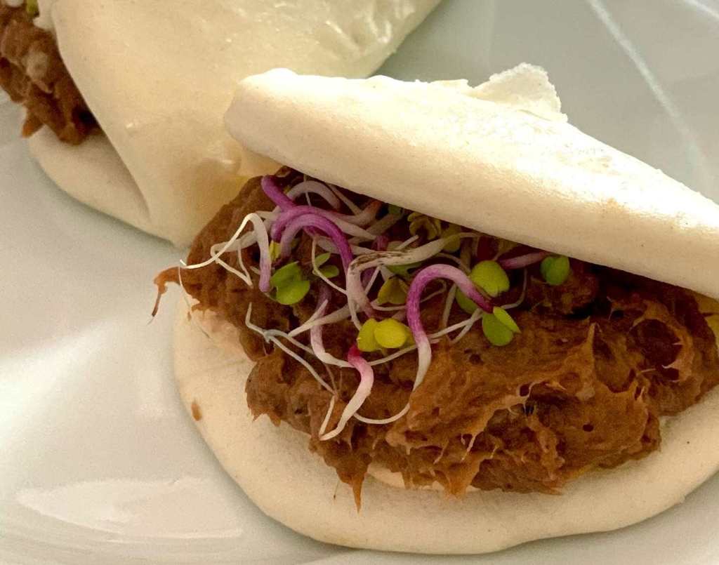 Y pan bao relleno de rabo de toro guisado con salsa kimchi y brotes de rabanitos. Todo buenísimo.