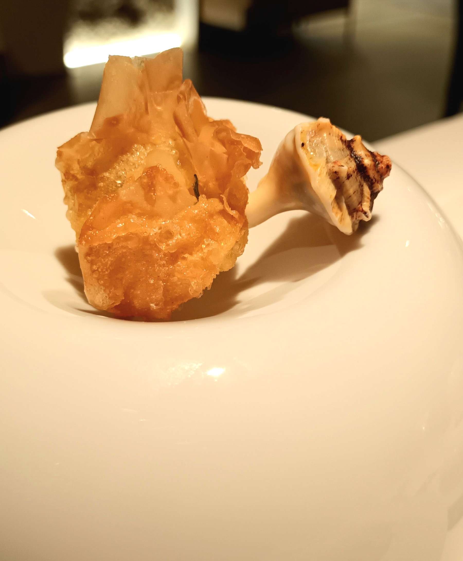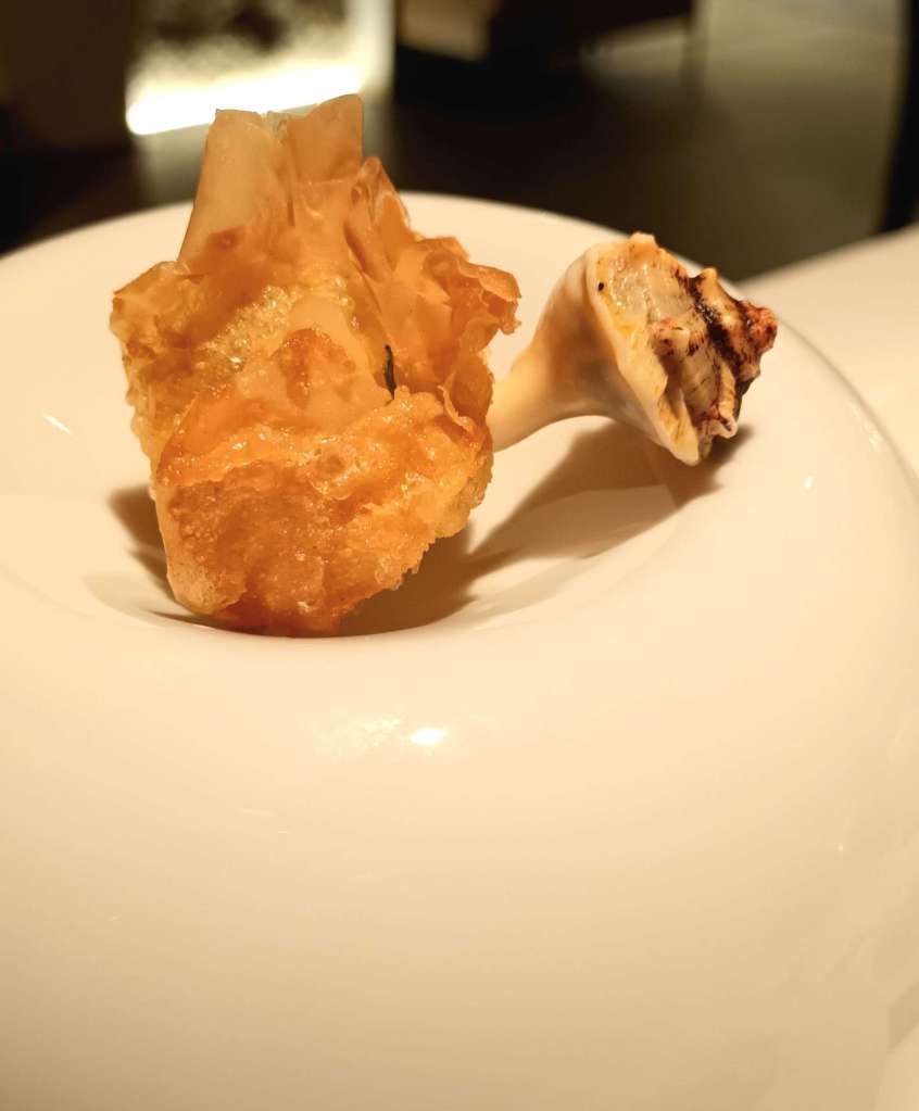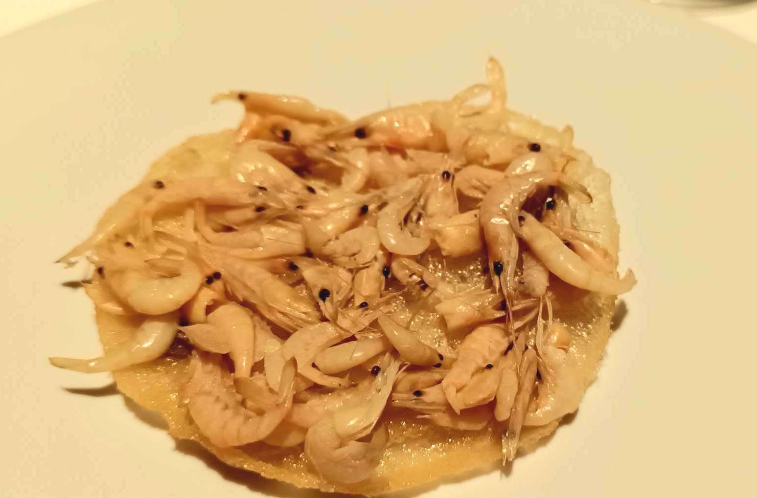 Comenzamos por varios aperitivos. Tortillita de camarones, con los camarones cocidos y sueltos, no fritos e integrados en la masa. Las tortillitas de camarones que creó Leon y se pueden tomar en Contraseña sí son fritas, pero muy originales, en forma de bastones…y riquísimas. Estas del menú son distintas y muy sabrosas, con los camarones muy bien cocidos y sobre una masa crujiente y fina.