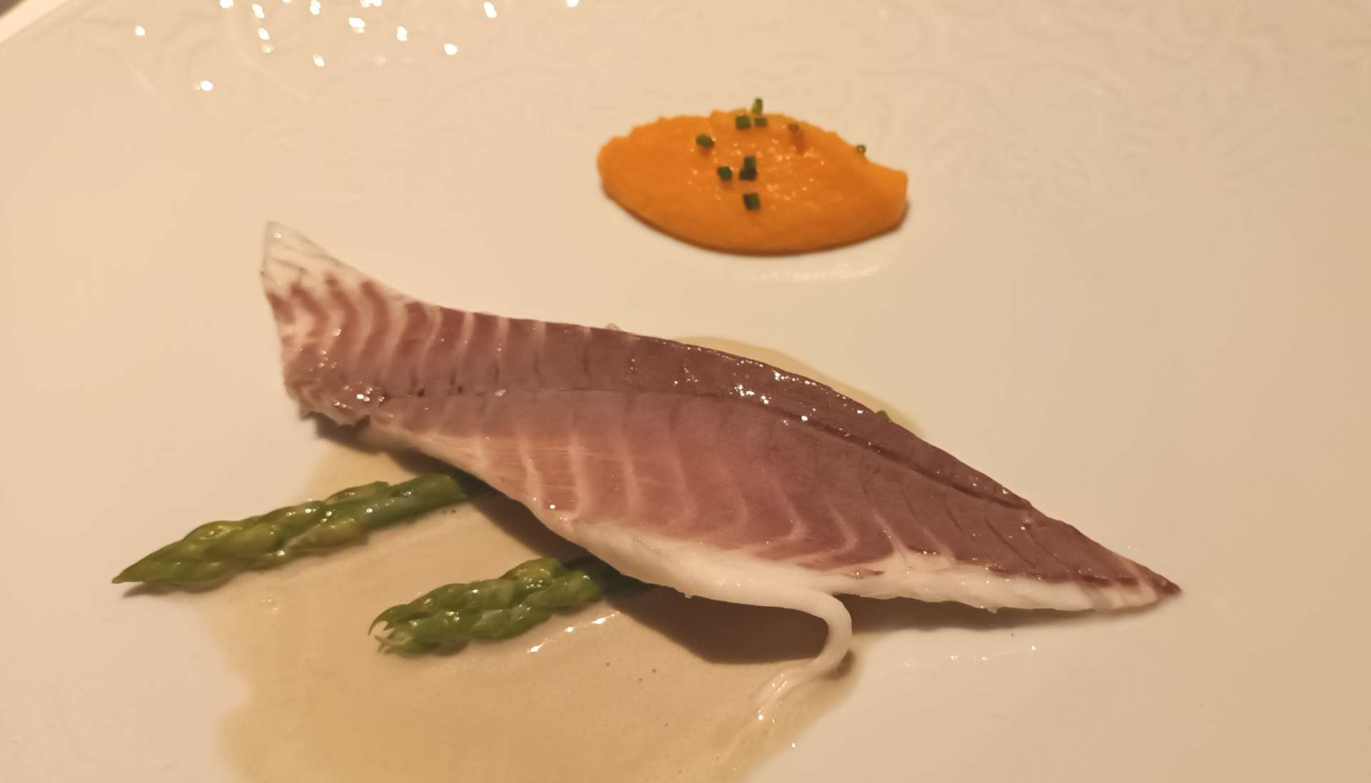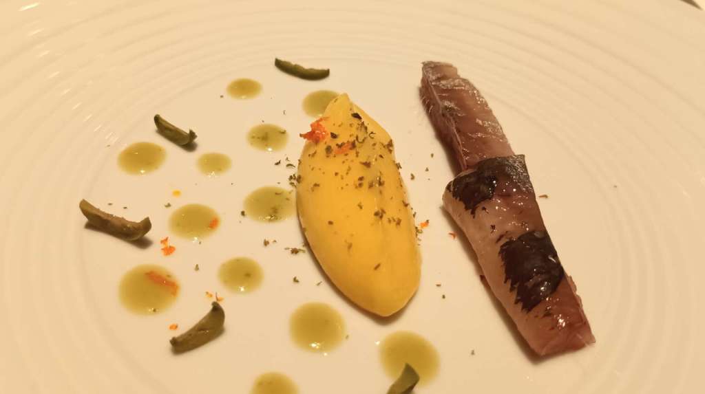 Albedo de naranja y sardina.  El albedo es la parte blanca de la cáscara de los cítricos, que en tiempos de escasez se freía para engordar los guisos, aquí se toma como puré acompañando sardinas marinadas. Desde hace algún tiempo está siendo utilizado por famosos chefs como ingrediente de sus platos. También acompañan pequeños trocitos de aceitunas, haciendo referencia a la cocina árabe.