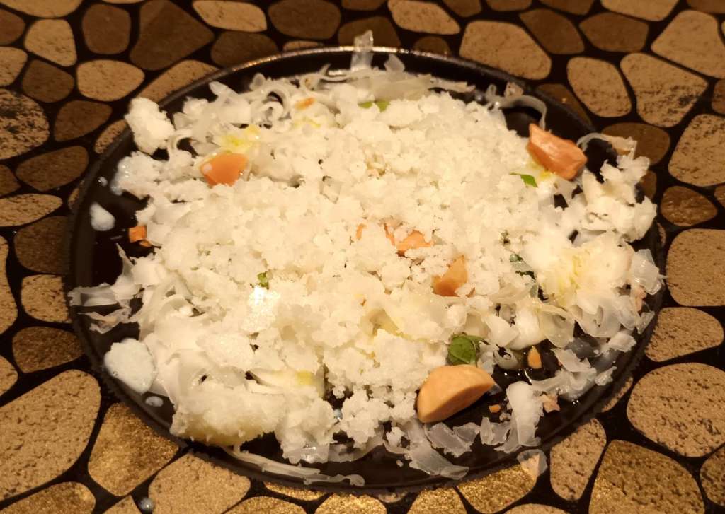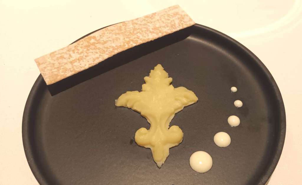 Flor de lis. Me llamó mucho la atención este plato por su historia. Es una brandada de bacalao en la que se ha sustituido la patata por chirivía. Acompañada por mayonesa alioli. La historia que tiene detrás nos lleva a tiempos del rey Fernando VII. La flor de lis es símbolo de los Borbones, y en algunas casas de Cádiz se colocó en la fachada este símbolo en los tiempos de este monarca durante la Guerra de la Independencia en la que tan importante papel jugó Cádiz.