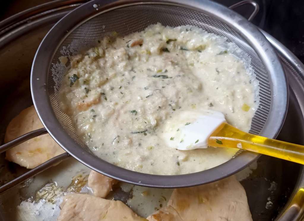 Hacemos los filetes de pollo en una plancha o sartén. Ya solo queda pasar la salsa por un chino o colador y echarla sobre los filetes.