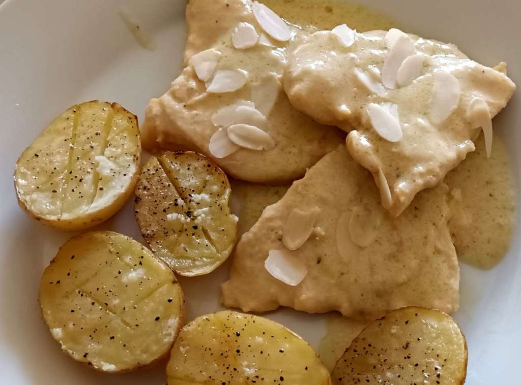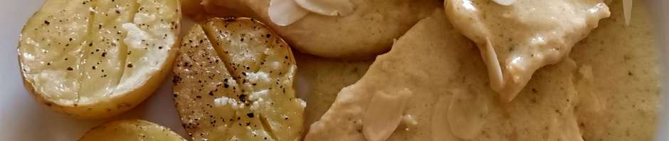 Como acompañamiento hice unas patatitas al horno con sal, pimienta molida y un chorrito de aceite. Y el pollo lo decoré con almendras laminadas, que también me habían sobrado de las comidas navideñas.