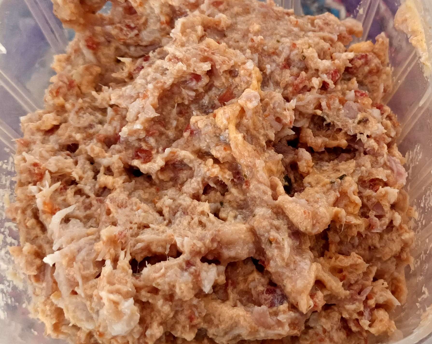 Estos están rellenos con la pringá de la berza que sobra. Una buena berza lleva carne de cerdo, tocino, morcilla y chorizo. Pues si nos sobra lo picamos todo y aplastamos bien, formando una pasta que es la que nos va a servir para hacer estos ricos emparedados.