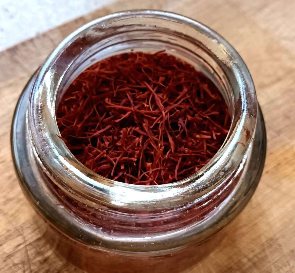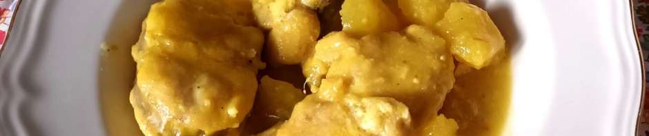 En la misma olla ponemos las patatas con unas hebras de azafrán y cubrimos con agua de haber cocido la cabeza, las dejamos cocer unos 15 minutos, hasta que estén tiernas. Como el azafrán no le dio el color que me gustaba añadí una pizca de colorante alimentario.