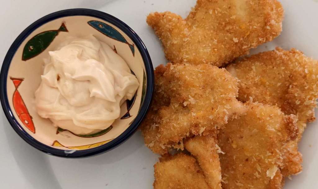 Cortamos las pechugas en trocitos y les echamos sal y zumo de limón. Las dejamos en el frigorífico tapadas algunas horas. Sacamos el pollo y los pasamos por pan rallado mezclado con panko y huevo batido: pan, huevo y pan. Los dejamos apartados hasta la hora de freírlos.