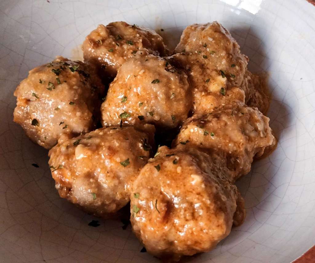 Añadimos las albóndigas, perejil, el vino y los piñones picados (o enteros), y lo dejamos unos minutos hasta que la salsa quede espesita. Suelen quedar con poca salsa, y riquísimas.