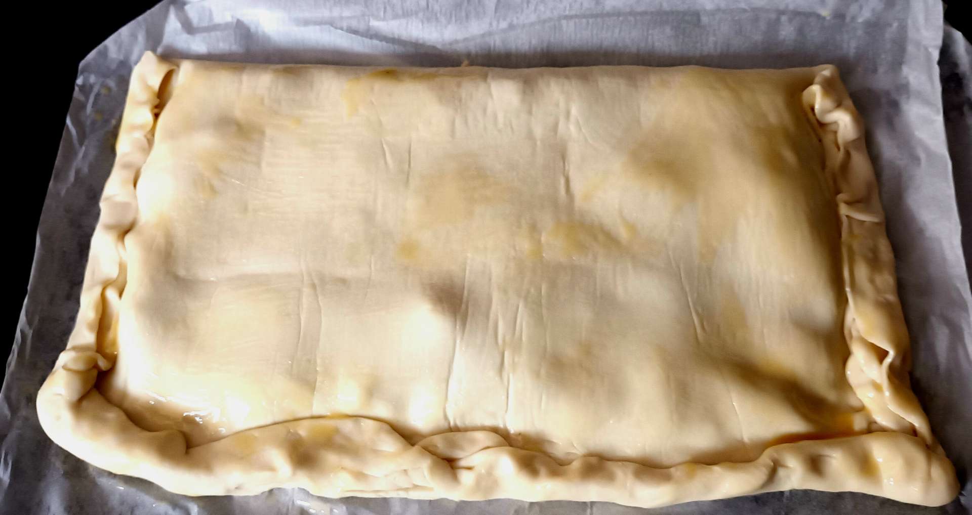 Extendemos la masa con un rodillo y ponemos la mezcla sobre la mitad, doblamos por encima la otra mitad y cerramos los bordes. Pintamos la superficie con huevo batido.