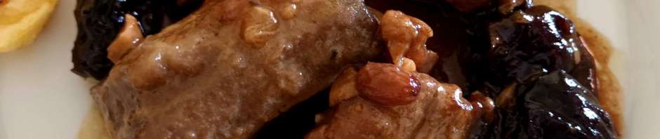 Para hacer las costillas uso la olla rápida, salen buenísimas y muy tiernas. En dicha olla echo un chorro de buen aceite de oliva y sofrío la cebolla y el ajo cortados en láminas. Una vez dorados echo las costillas y las mareo un poco, añado el orégano, la pimienta, el tomillo y sal. Vuelvo a mover todo y añado el vino y agua que las cubra. Dejo que se hagan unos 15 minutos, abro la olla y echo las ciruelas y pasas, las que queramos, y vuelvo a ponerlo al fuego pero esta vez sin tapadera, y solo uno o dos minutos, no más, para que no se deshagan los frutos secos.