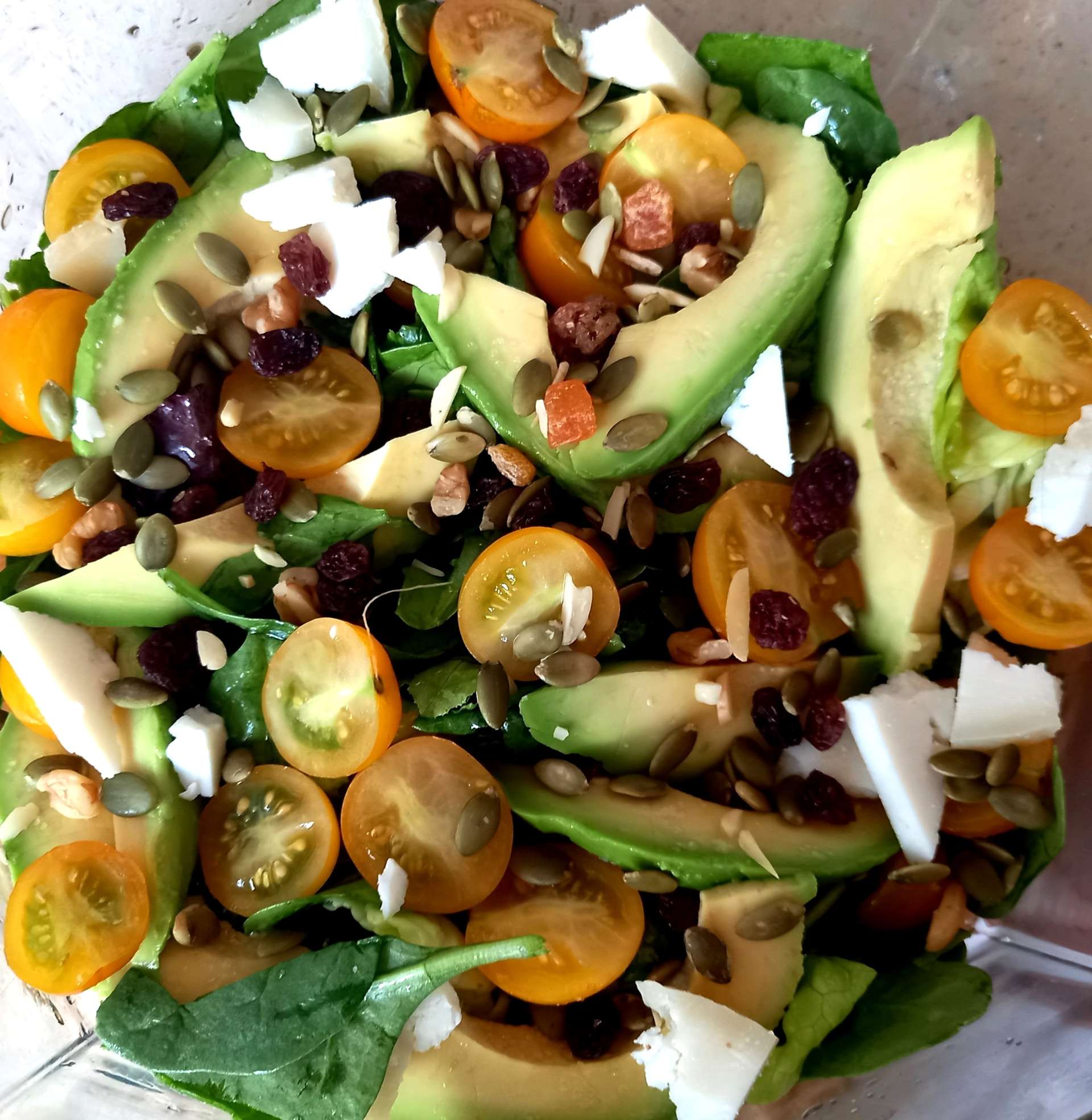 - Aguacate, tomatitos cherry, queso fresco y frutos secos