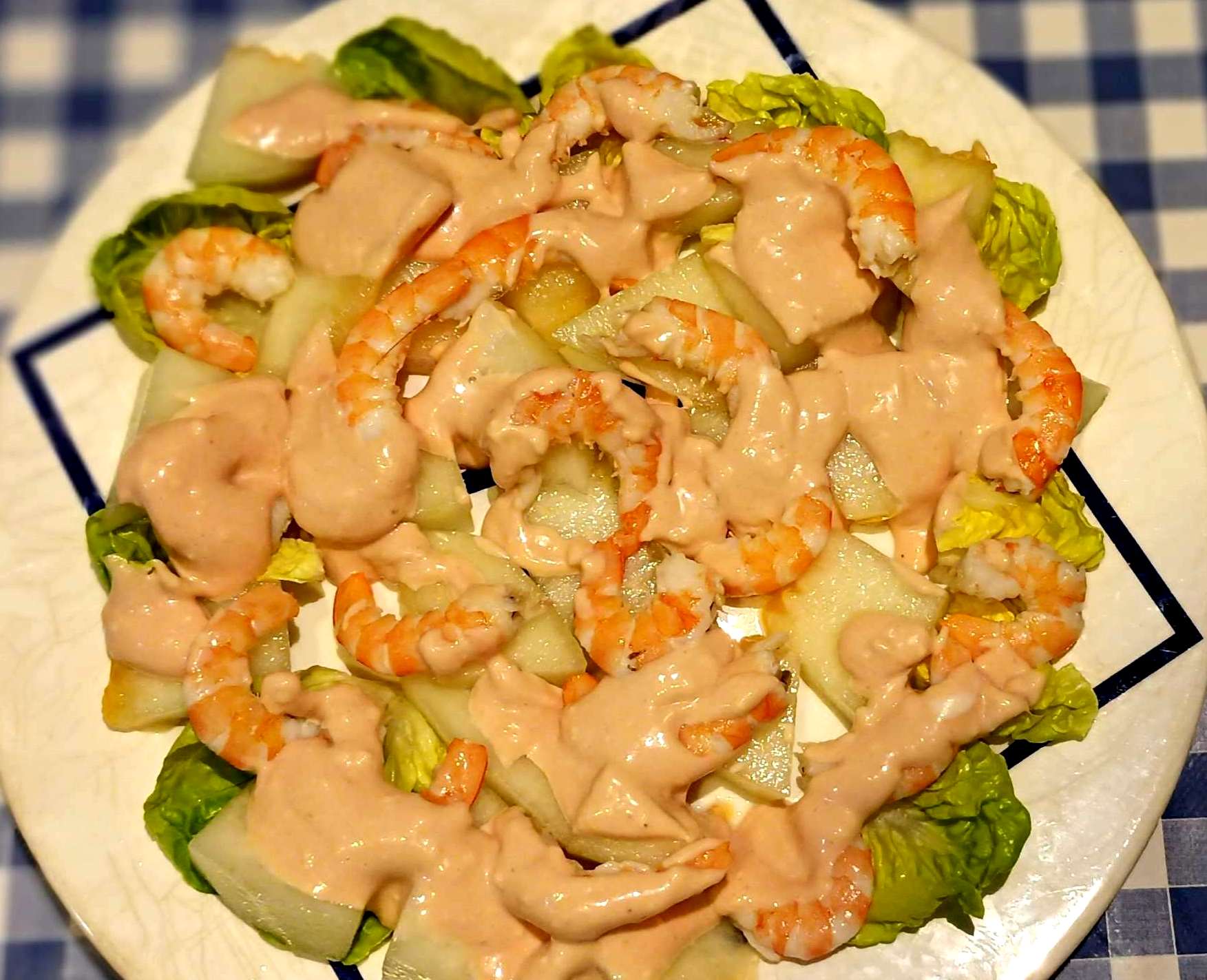 Melón, cogollos, gambas o langostinos y salsa rosa