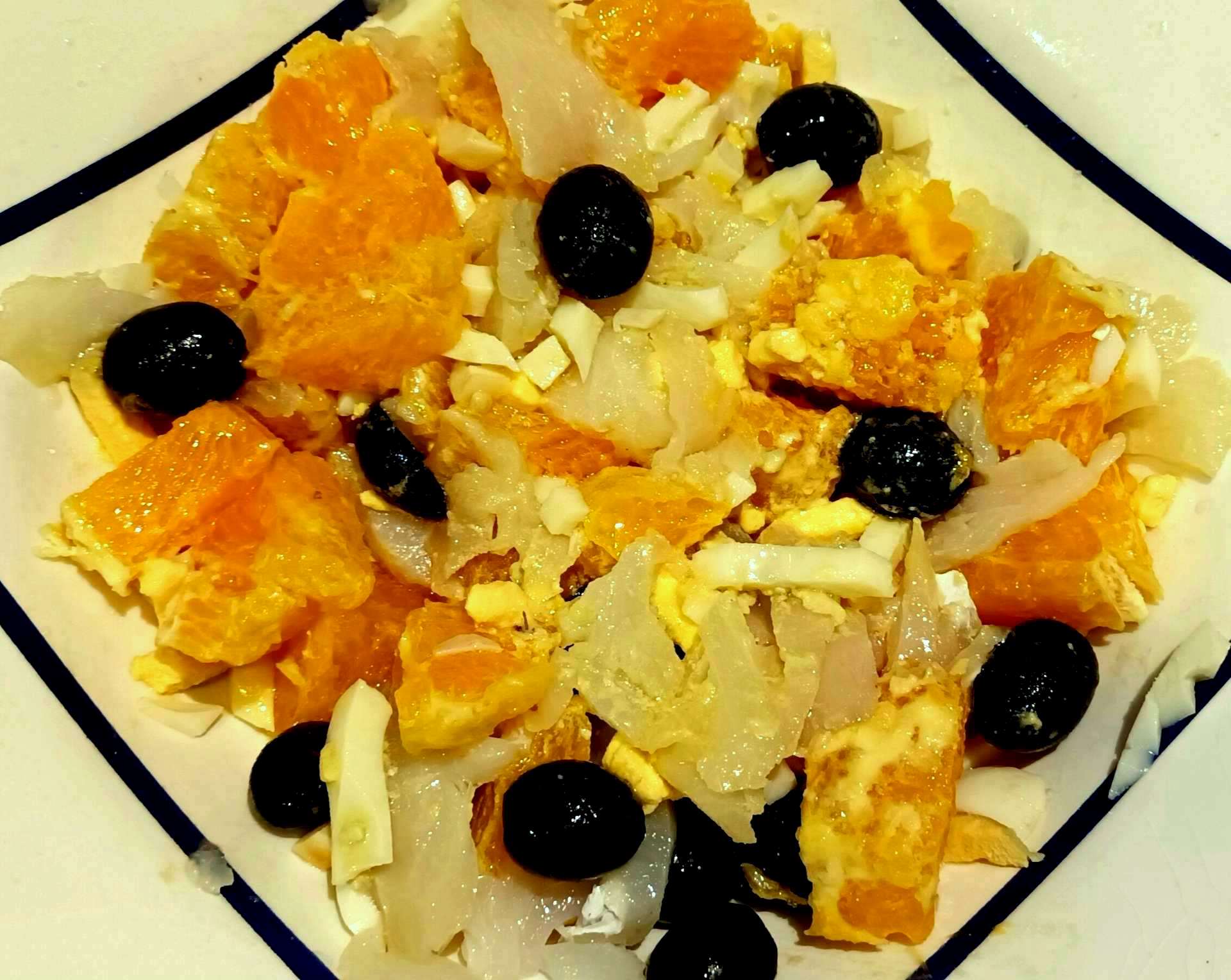 Naranja, bacalao ahumado, huevo duro y aceitunas negras