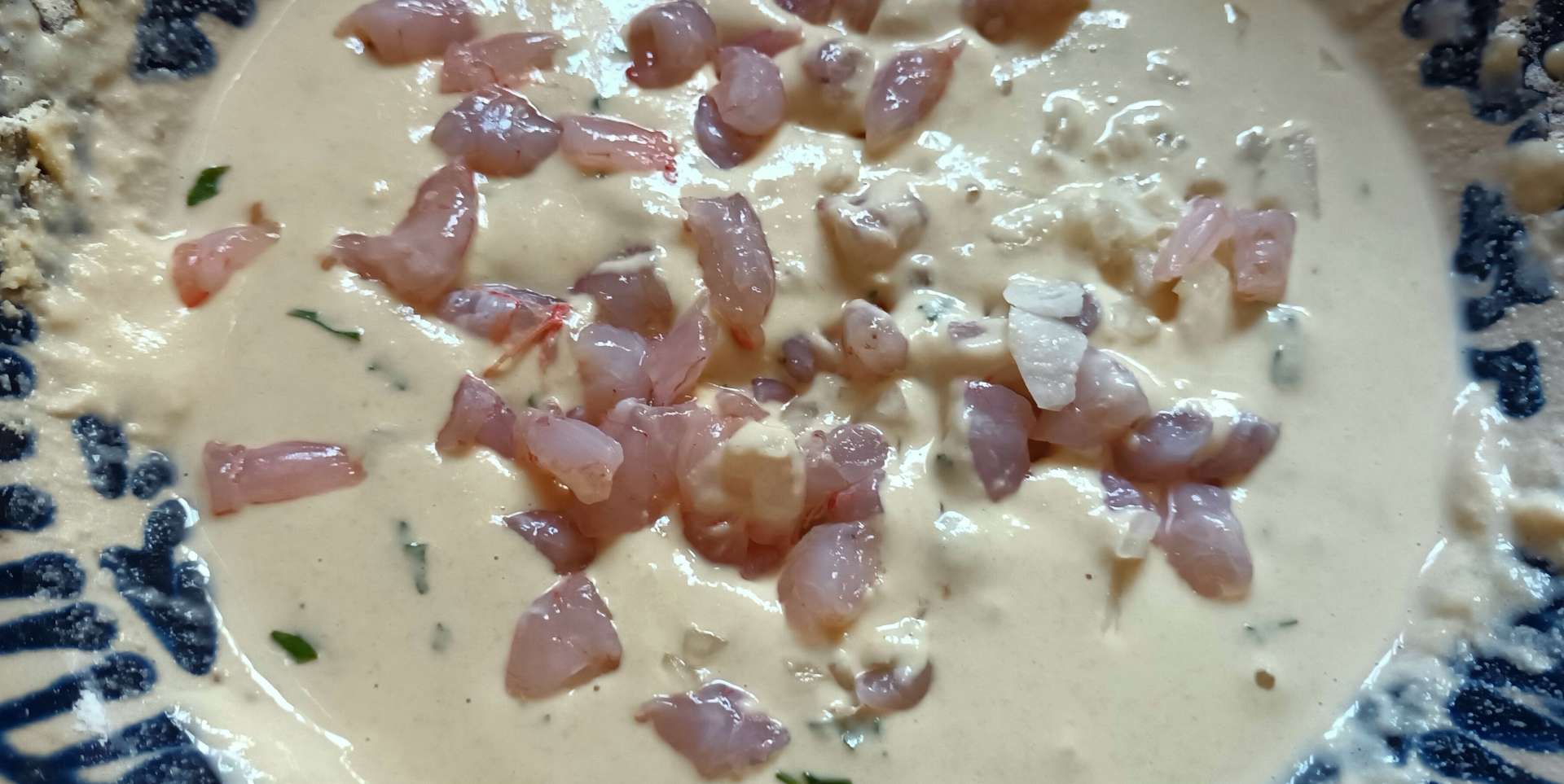 En un cuenco grande echamos las gambas, la cebolla y el perejil muy picadito todo y las harinas. Mezclamos bien.