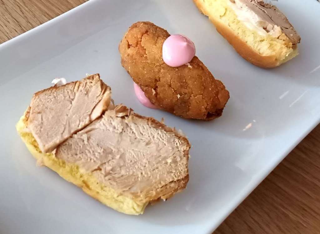 Pues comenzamos la comida con unos entrantes, croquetas de morcón ibérico sobre alioli de fresas y brioches con lomo y alioli de membrillo.