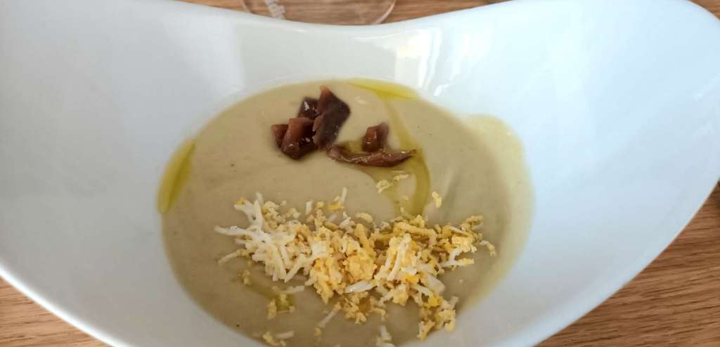 Tras los entrantes llegó un salmorejo de uvas con anchoas y huevo rizado que fue maridado con un vino blanco Alba de Balbaina, 100 % uva palomino.