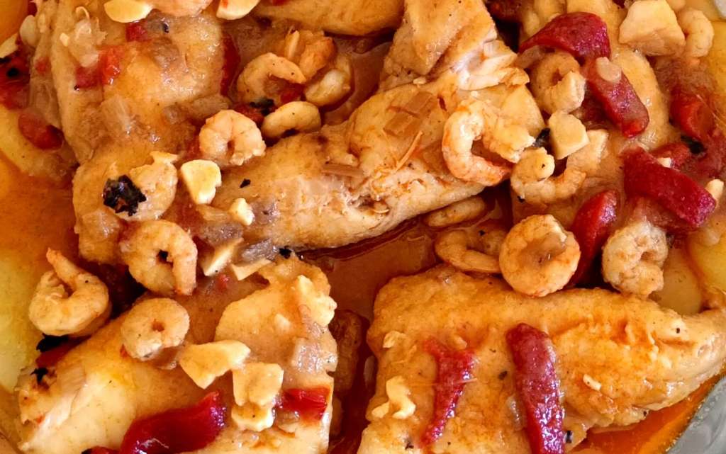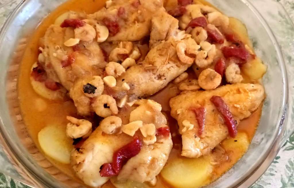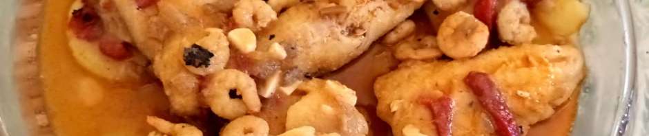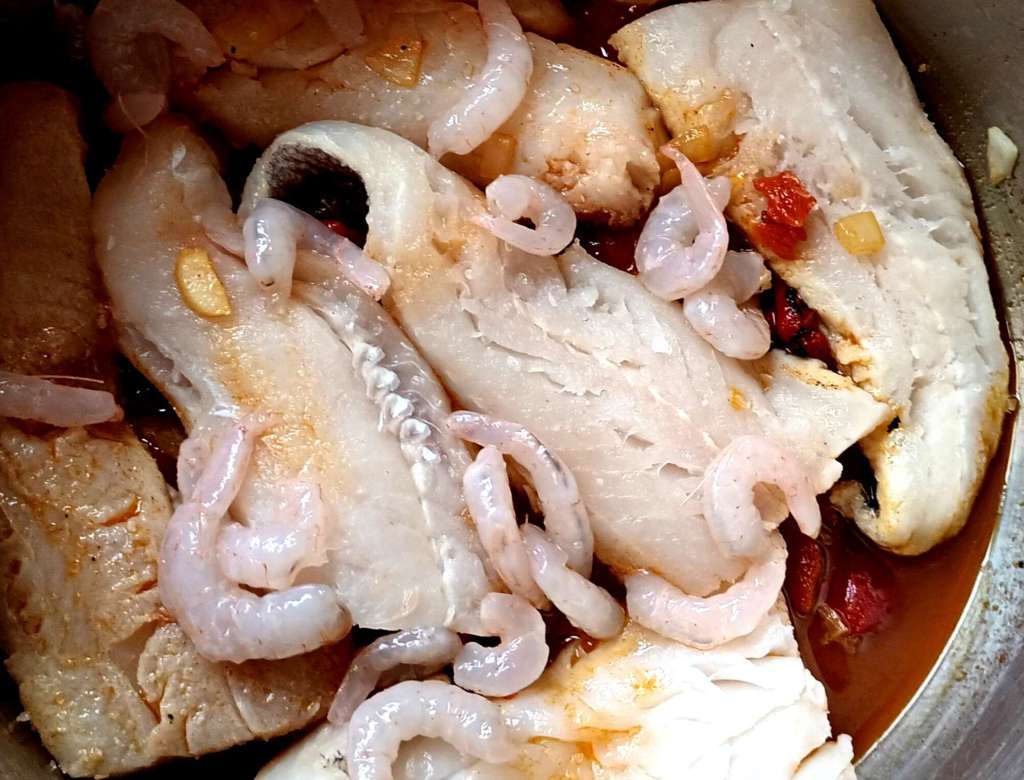 Sazonamos a gusto y añadimos caldo de pescado o agua. Cuando la merluza esté casi hecha añadimos las gambas peladas.