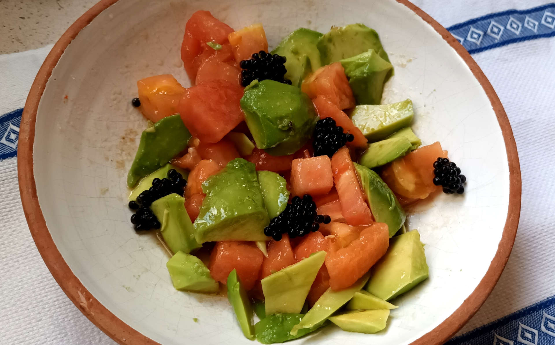 Hacemos una ensalada con aguacate y tomate, aliñada con sal, vinagre de Jerez y aceite de oliva virgen extra.