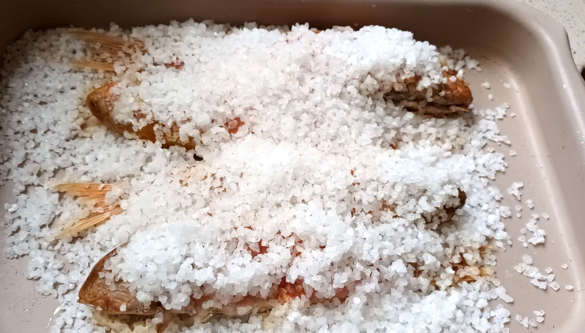 Ponemos sal de horno en el fondo de una bandeja y ponemos encima los salmonetes, los cubrimos con más sal de forma que queden bien cubiertos.