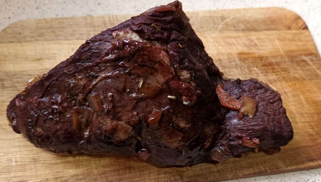 Salpimentamos la carne y la marcamos en un poco de aceite bien caliente. La reservamos. En el mismo aceite sofreímos la cebolla, los ajos, el puerro y la zanahoria, todo muy picadito, sin que se doren mucho. Añadimos el vino, una hoja de laurel, un pellizco de tomillo y romero y unos granos de pimienta.