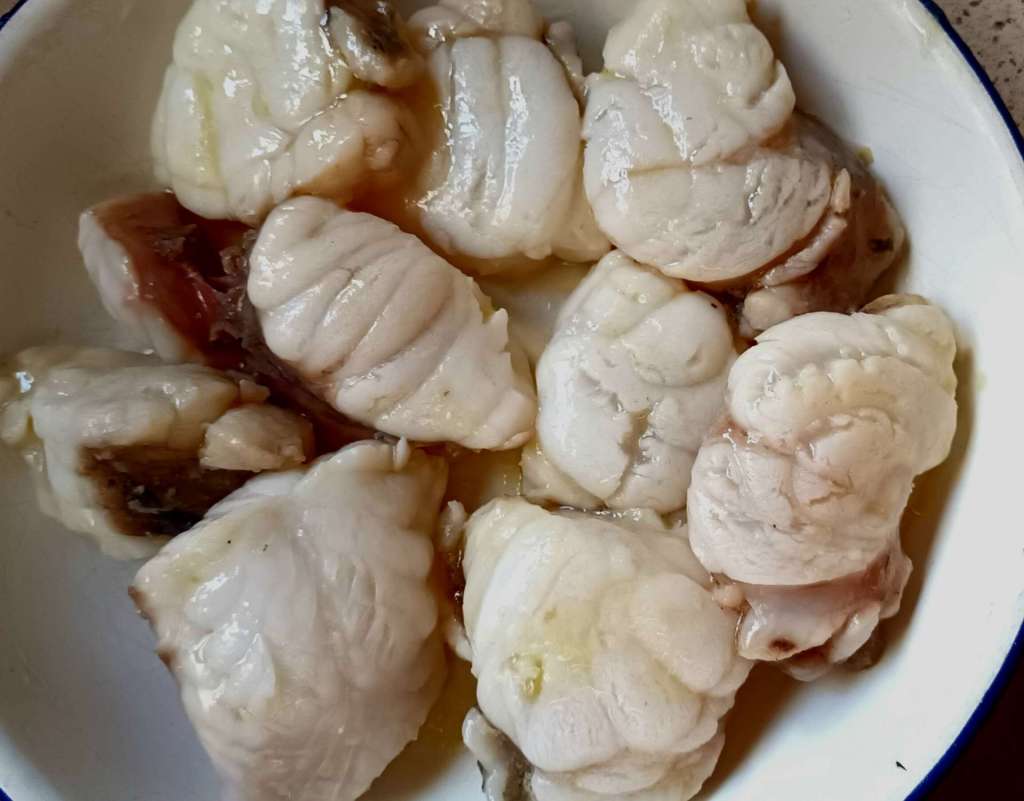 El caldo lo podemos hacer usando las espinas del rape. En un mortero majamos las almendras, el pan, pimentón y aceite.