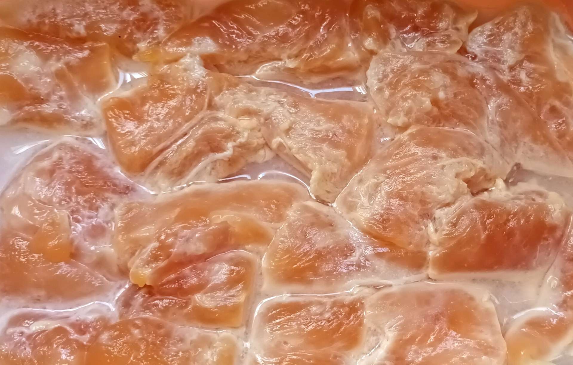 Limpiamos la pechuga y la cortamos en trocitos, le echamos sal y zumo de limón y los dejamos macerar unas horas.