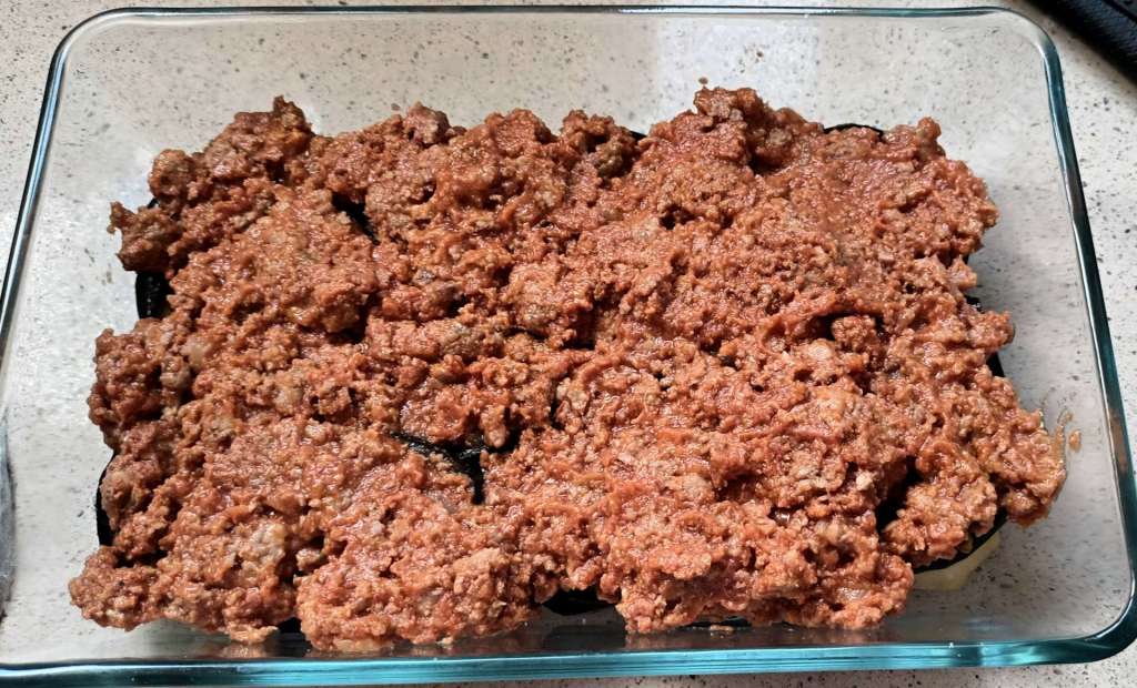 Sofreímos un poco de cebolla y pasamos la carne, ya salpimentada. Y ya con los tres ingredientes listos montamos la musaka en una bandeja de horno. La primera capa de patatas, luego un poco de tomate frito, la siguiente capa de berenjenas y otra vez tomate frito. Podemos poner varias capas y, por último, la carne picada. La capa inferior tiene que ser la patata y la superior la carne picada.