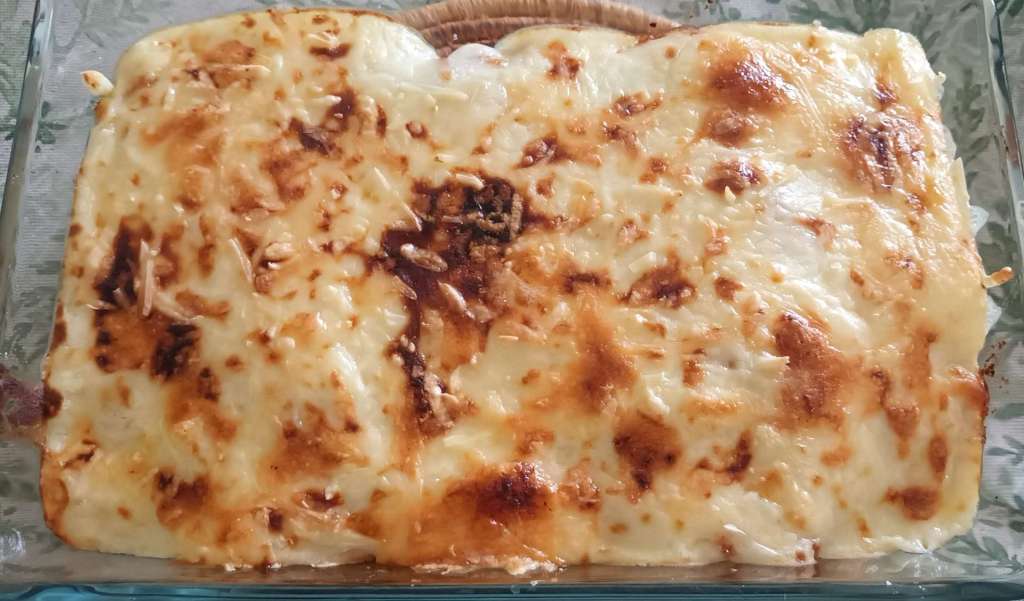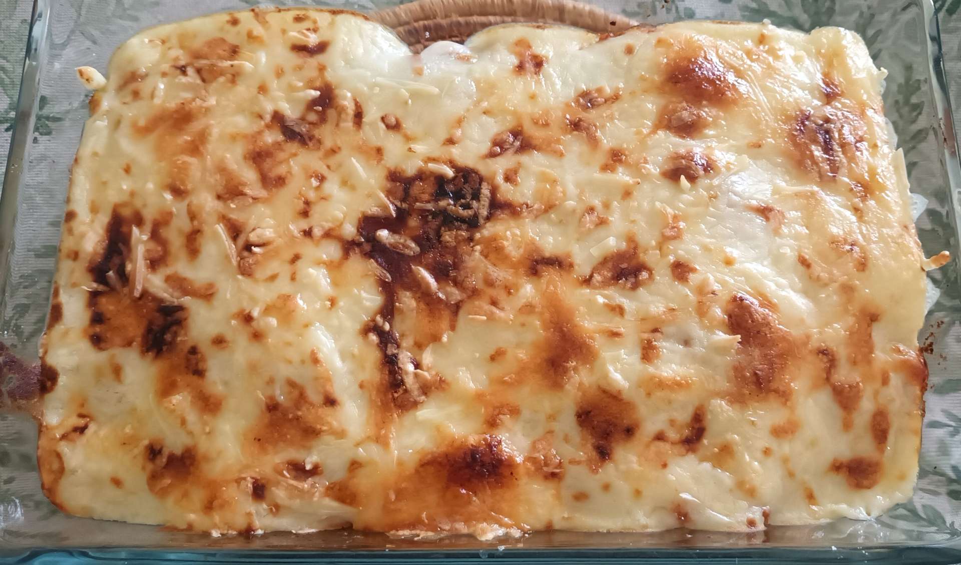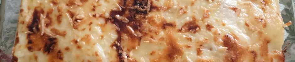 Echamos la bechamel sobre la carne picada y queso rallado por encima. La metemos en el horno precalentado a 180º, subimos a 190º y la sacamos cuando la superficie esté dorada. Riquísima.