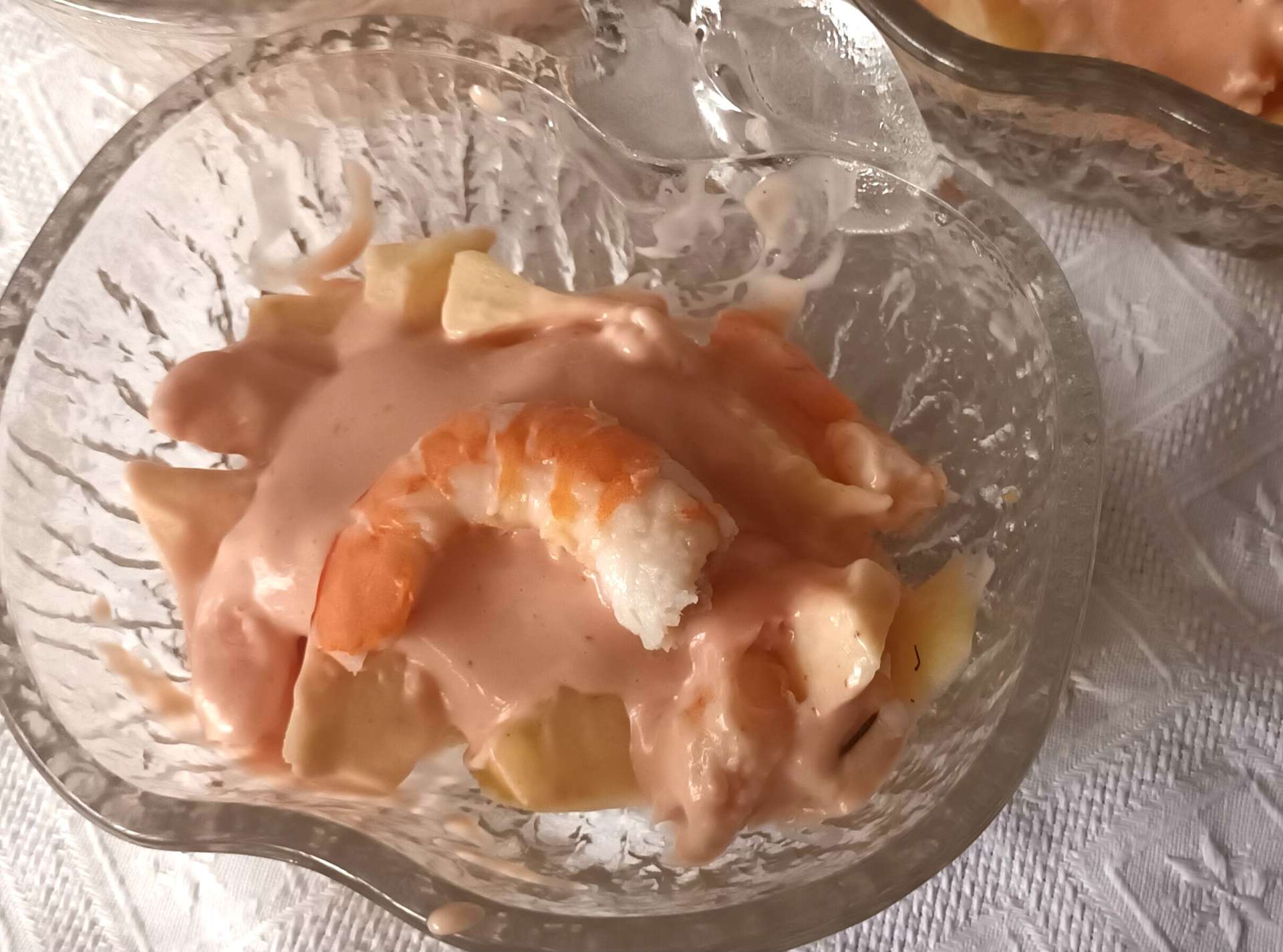 Echamos por encima la salsa rosa y decoramos con la gamba o langostino entero que hemos reservado. Se come mezclando todo…delicioso.