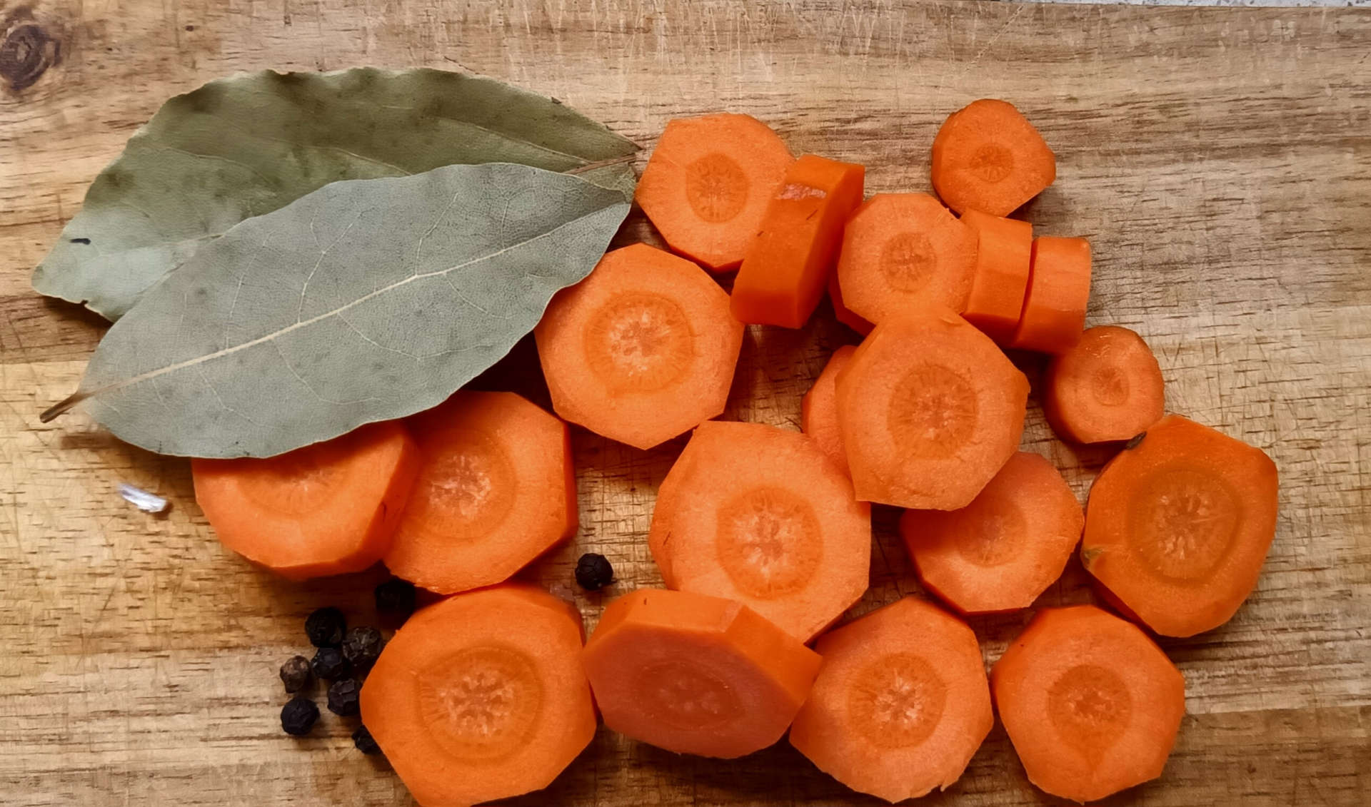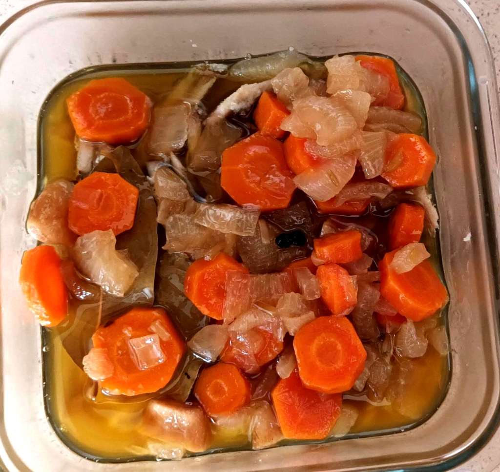 Se doran en el aceite los dientes de ajo pelados y cortados por la mitad, se añade la cebolla cortada en juliana y la zanahoria pelada y cortada en rodajitas. Se deja todo unos minutos hasta que se ablanden.