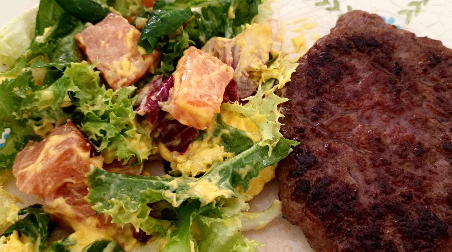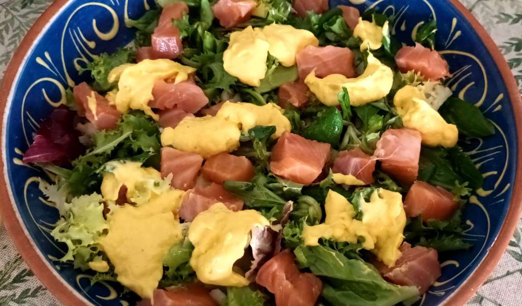 Para tomarla mezclamos la salsa con las lechugas y el salmón y nos queda una ensalada riquísima, para tomar sola o acompañando algún otro plato de carne o pescado, por ejemplo.