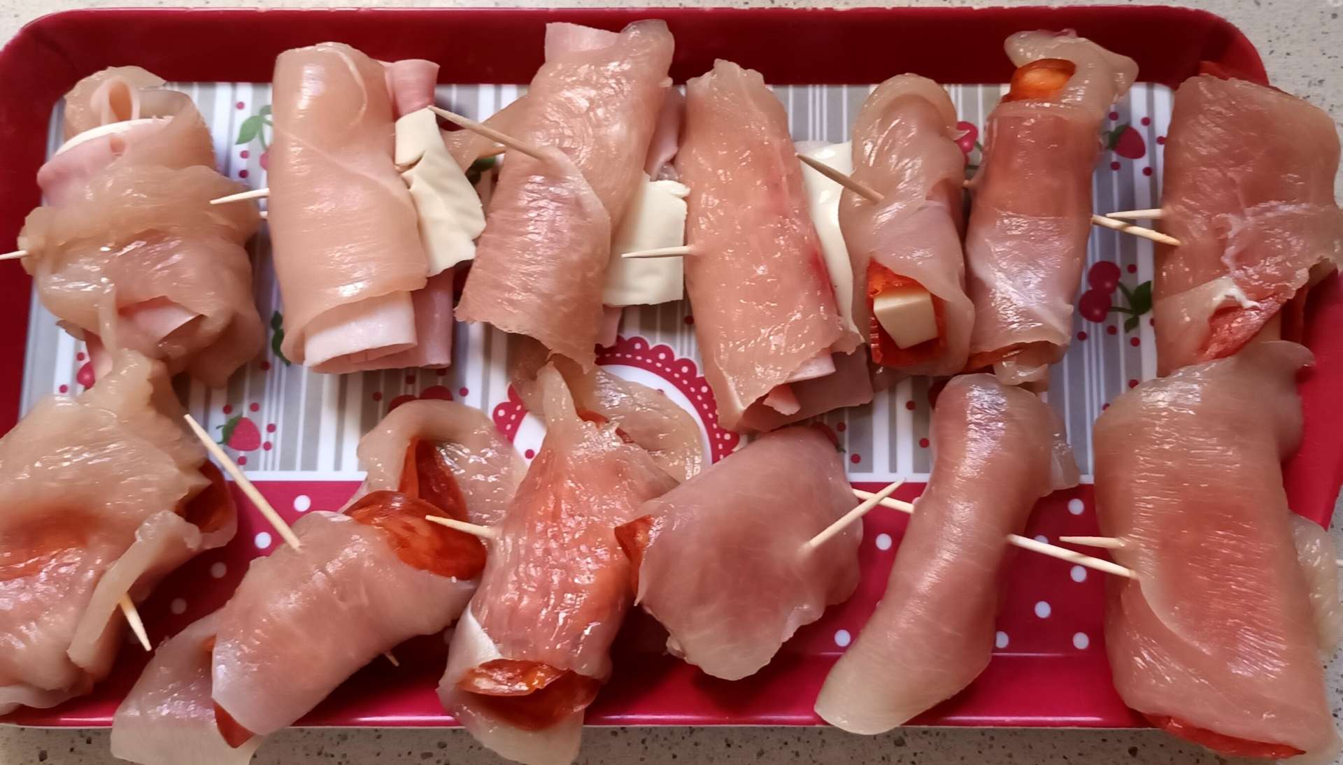 Estos ratoncitos o rollitos se pueden hacer con ternera, cerdo, pollo…y rellenarlos con jamón cocido o ibérico, chorizo, queso más o menos curado…Se pueden «meter» en salsa o empanarlos, como en este caso.