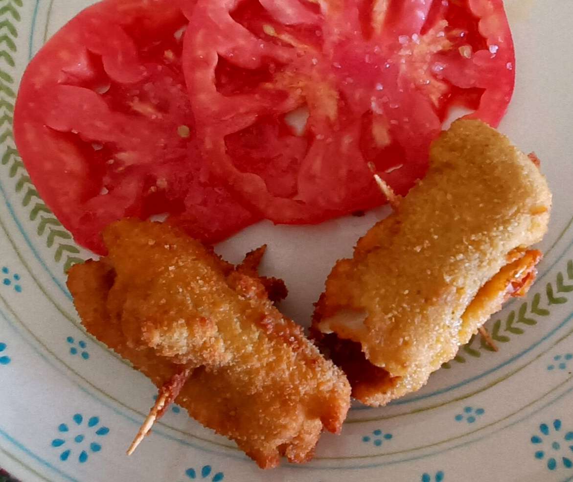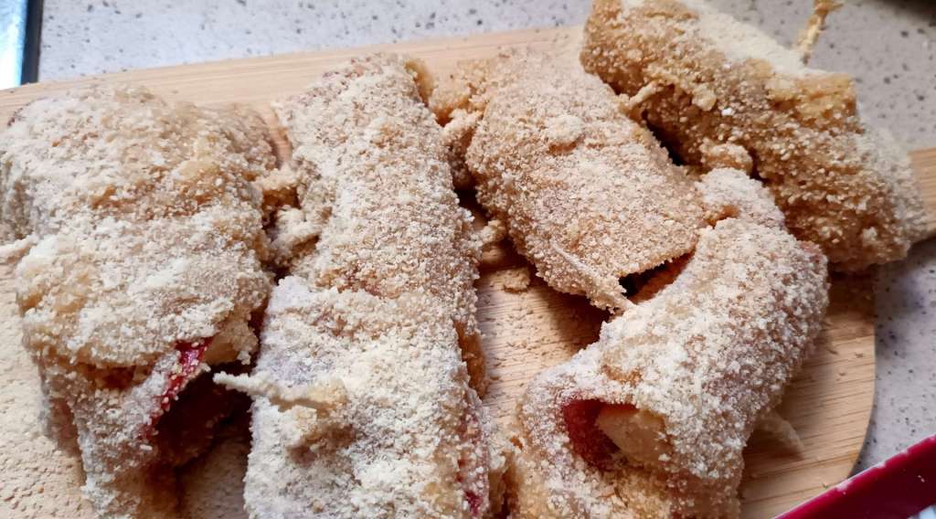 Los unimos con un palillo y los empanamos con pan rallado y huevo batido.