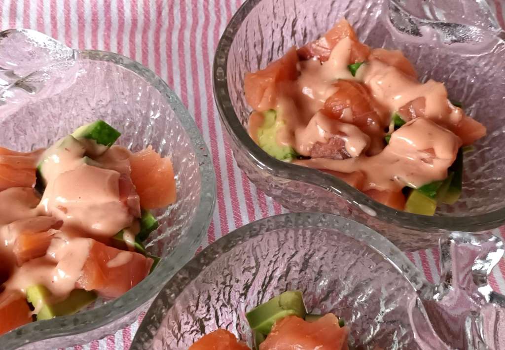 Ponemos una capa de aguacate y encima otra de salmón, y añadimos la salsa rosa.