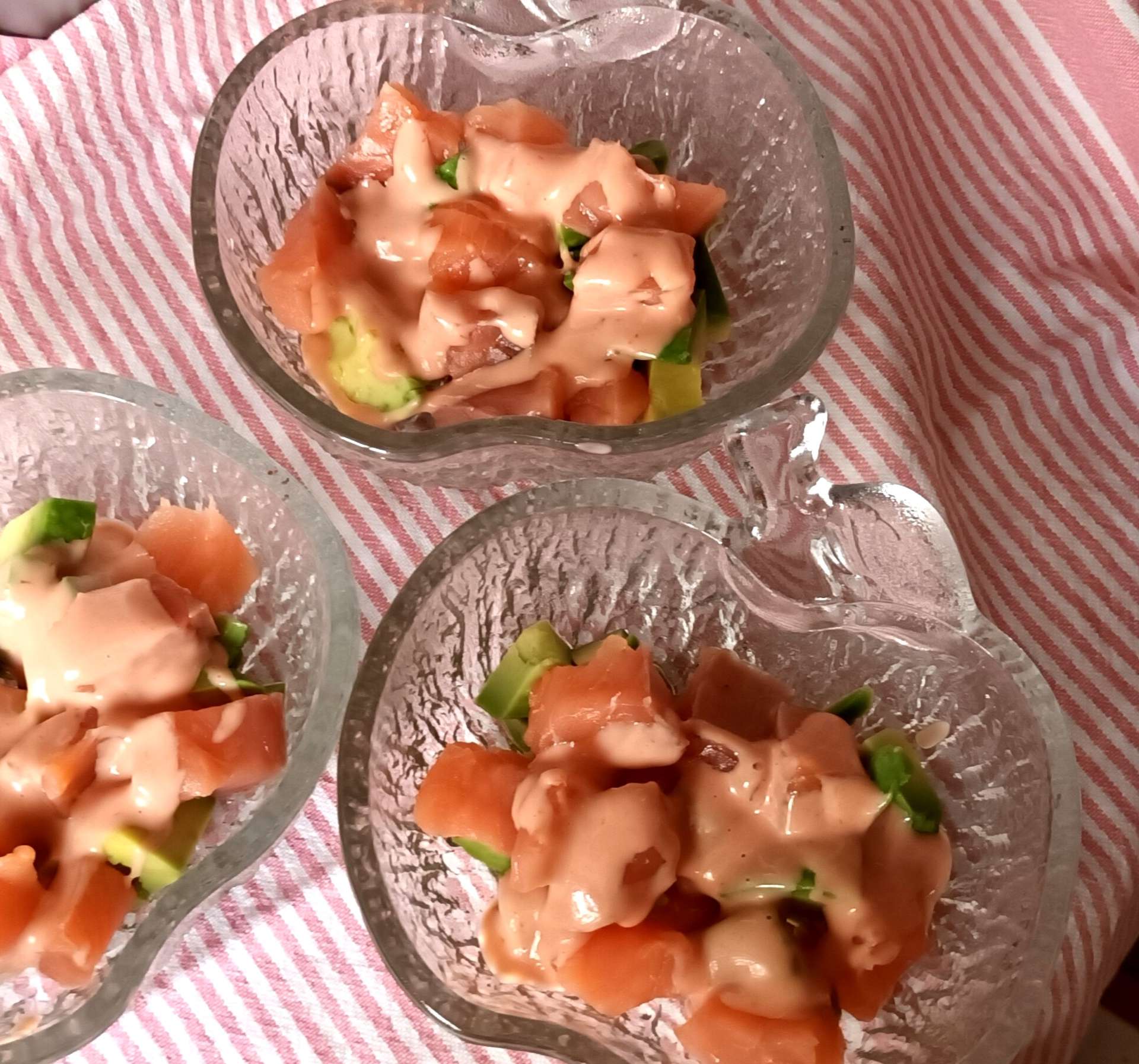 Ponemos una capa de aguacate y encima otra de salmón, y añadimos la salsa rosa.