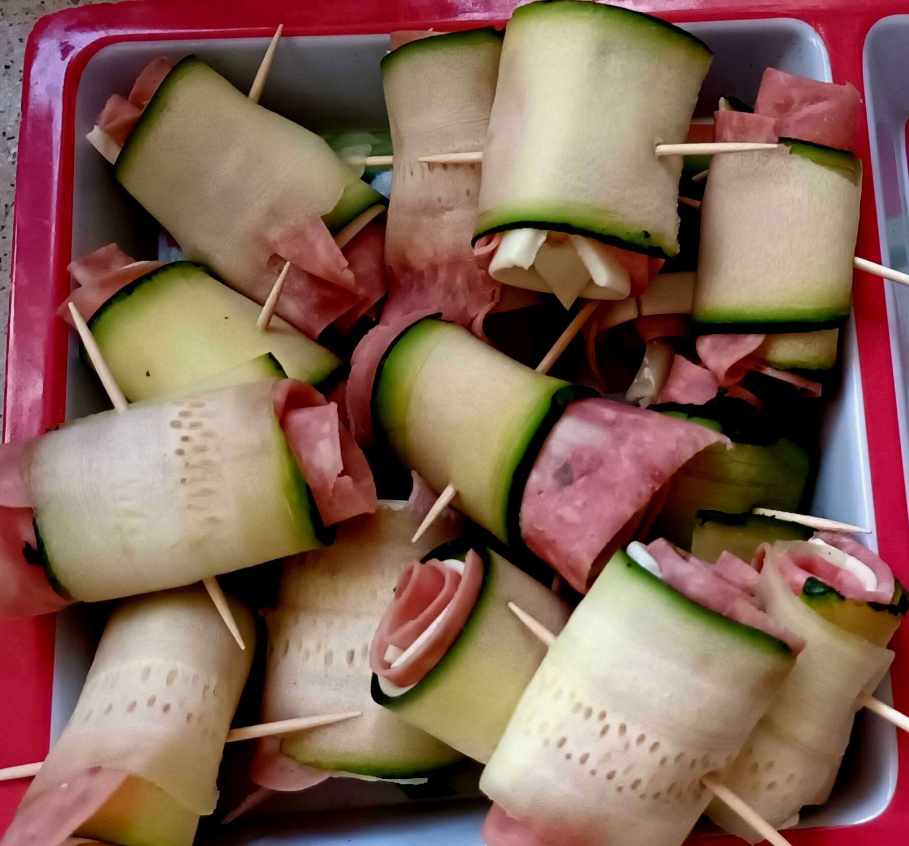 Cortamos el calabacín en láminas longitudinales muy finas, mejor hacerlo con una mandolina. Las pasamos por la sartén un poco para que no se rompan, y encima de cada una ponemos una loncha de choped pork y otra de queso en loncha. Por supuesto podemos usar jamón cocido. Lo enrollamos y cerramos con un palillo.