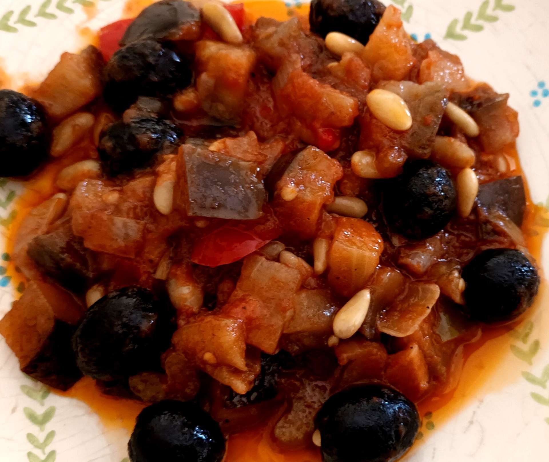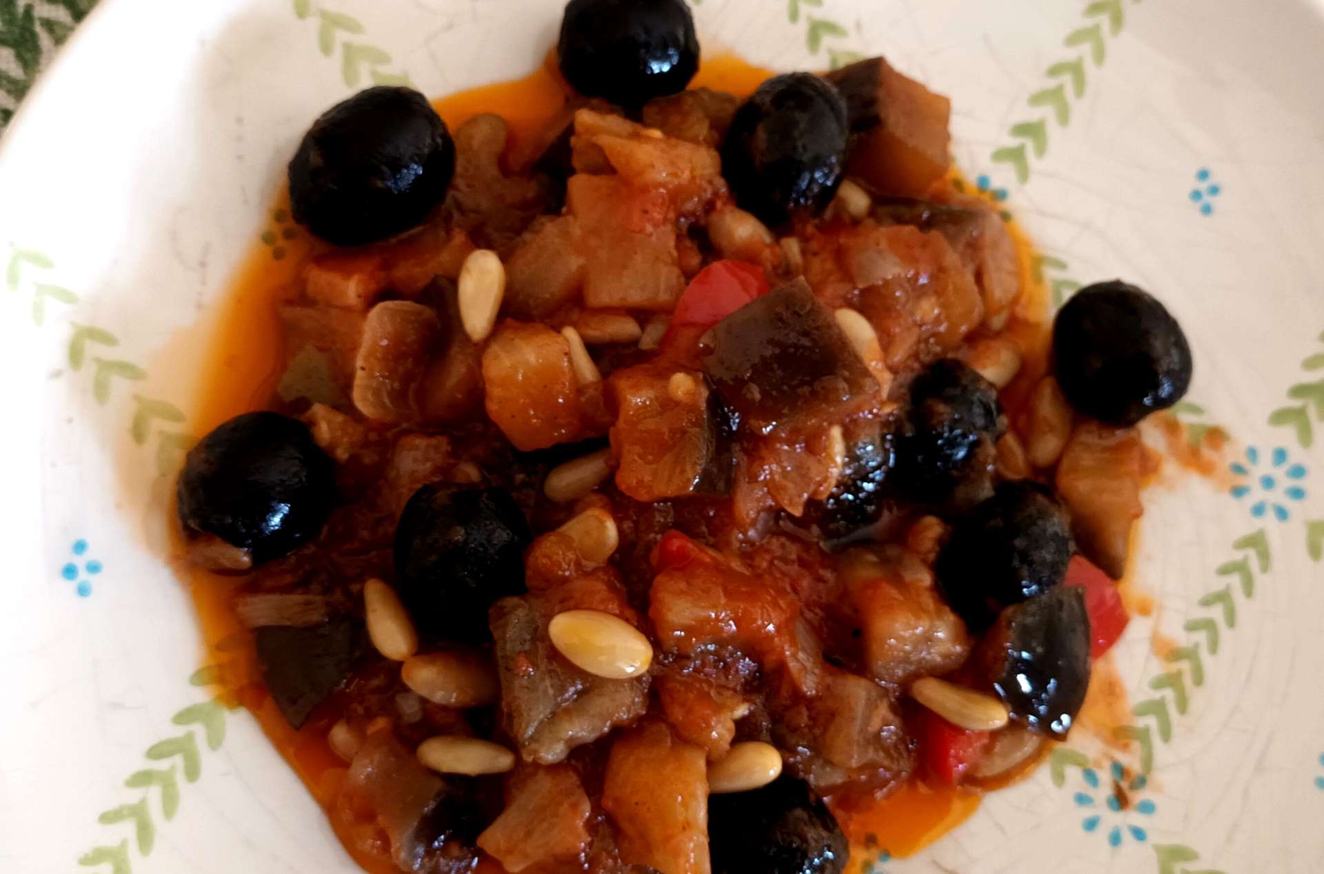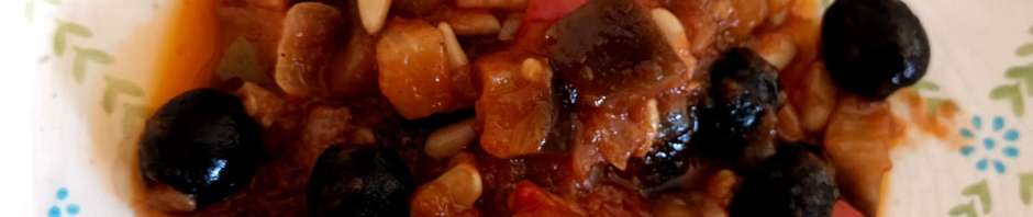 La caponata es un plato italiano, más concretamente siciliano, compuesto de varias verduras, aceitunas negras y frutos secos que pueden ser nueces, anacardos, piñones…