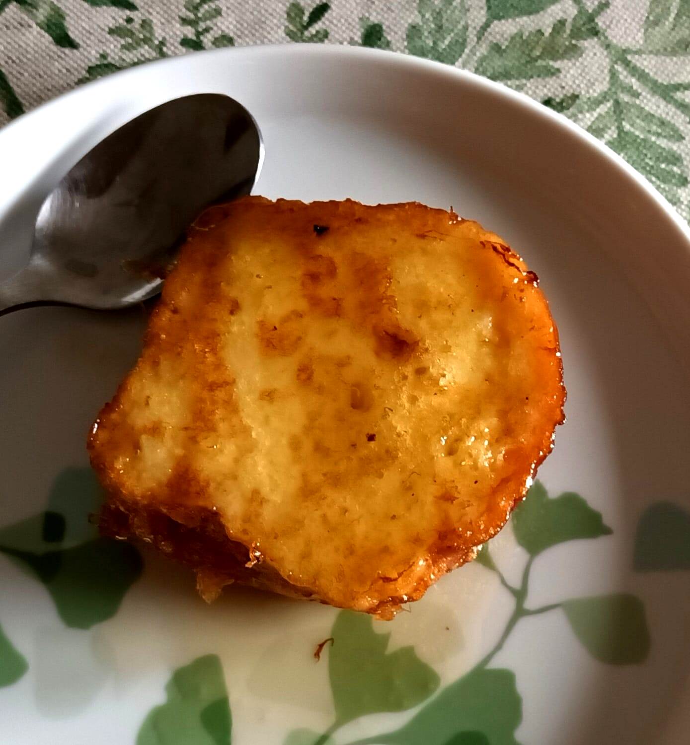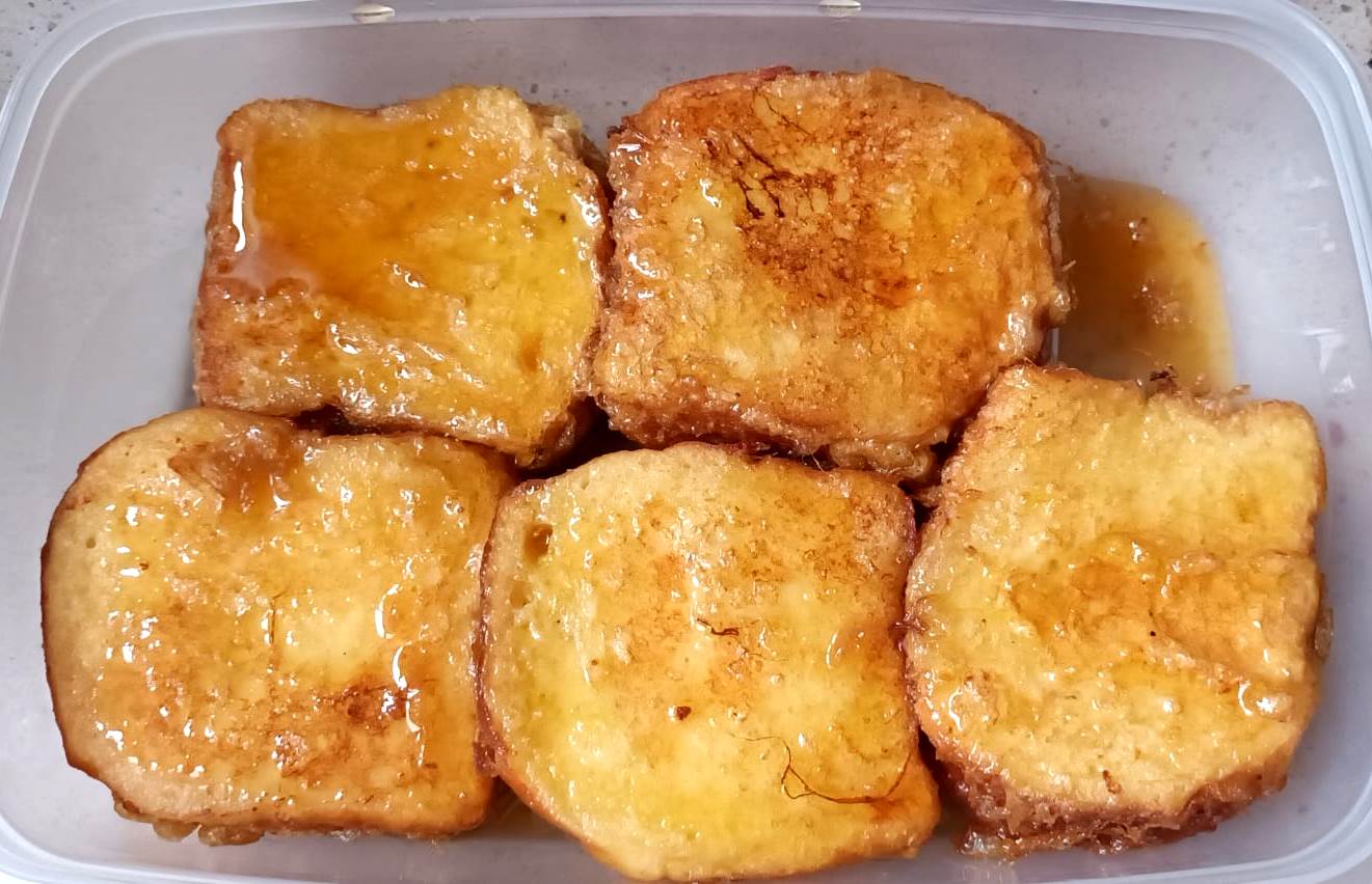Batimos huevos y calentamos aceite. Vamos pasando las rodajas de pan por huevo batido y las freímos por ambas caras en aceite bien caliente. Las sacamos y ponemos a escurrir sobre papel de cocina.