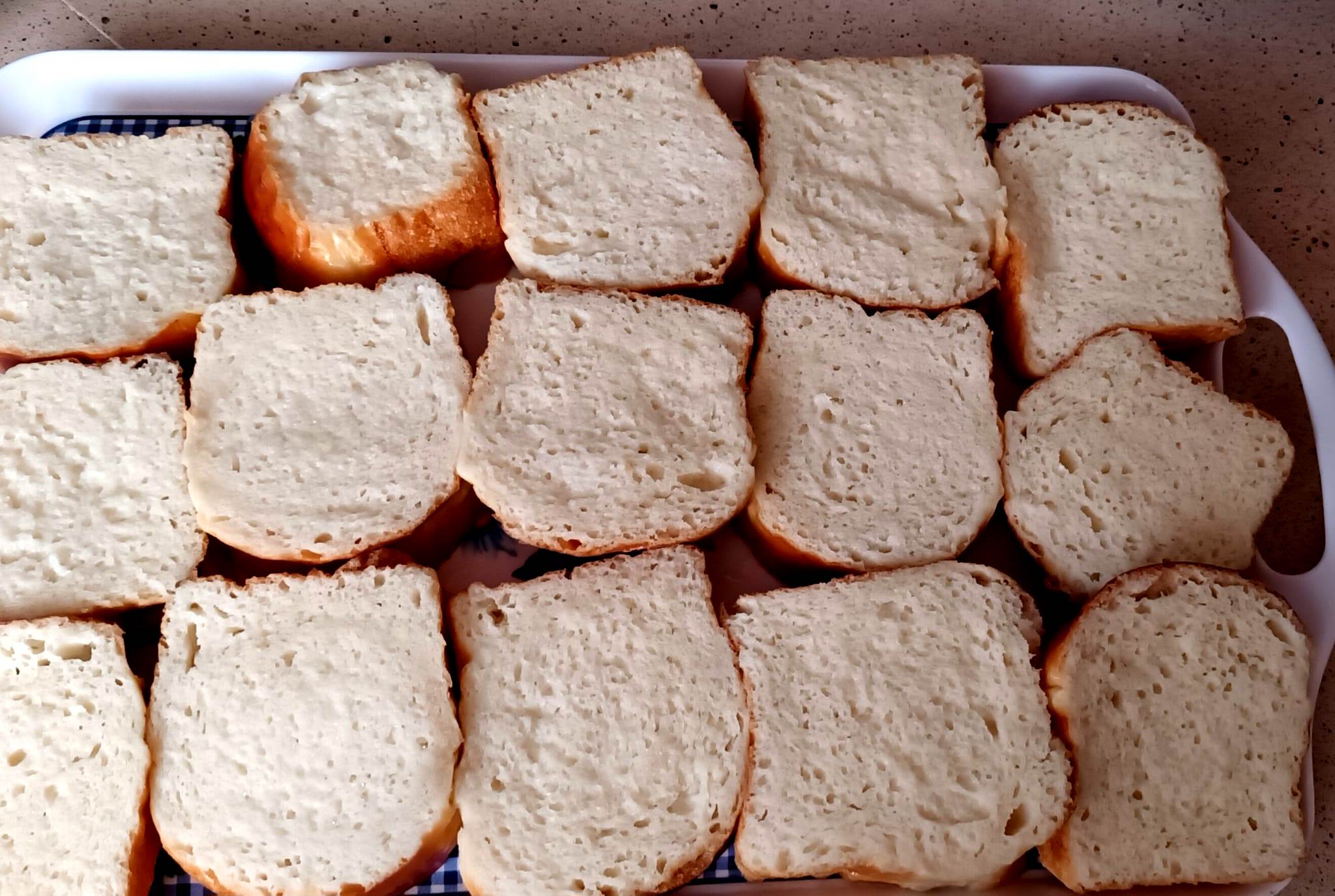 En primer lugar quiero decir que no pongo medidas porque dependerán de la cantidad de pan y torrijas que hagamos. Dejamos que el pan se ponga recio, sin llegar a estar duro. Lo cortamos en rodajas no muy finas, más bien gorditas. Este año hemos hecho un pan de menor tamaño, así que las torrijas han salido más pequeñas.