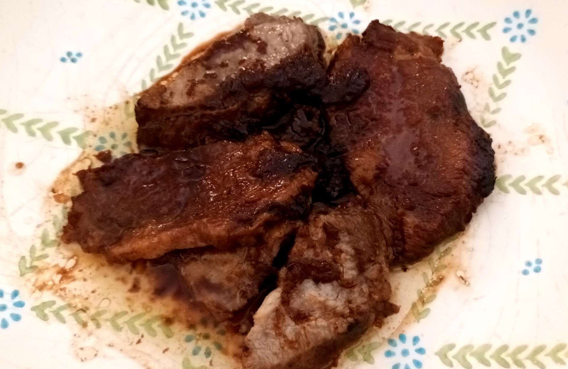 Ponemos la carne en la olla y la doramos por ambos lados, echamos sal, el vino y un poco de agua, que la cubra. Dejamos que se haga, unos 15 minutos, con el fuego al 7. Cuando la olla se pueda abrir comprobamos que está tierna. La dejamos enfriar y la cortamos en rodajas.