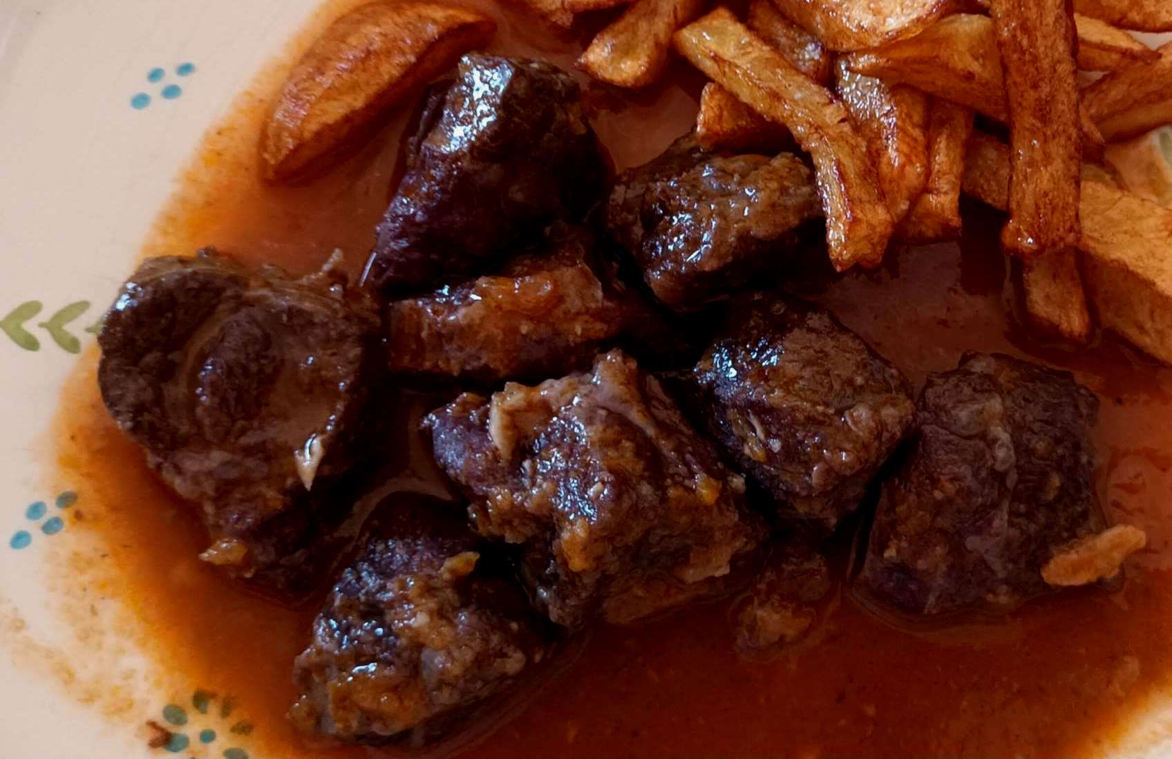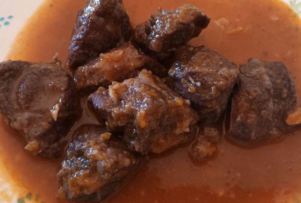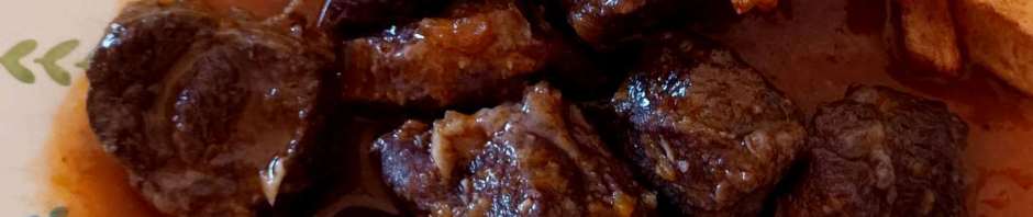 En el mismo aceite se rehogan el ajo, la cebolla y las zanahorias. Se añade el tomate y se deja hacer unos minutos, Echar la carne, el vino y el caldo. Con la olla exprés bastan 20 minutos. Deben quedar tiernas. Se trituran las verduras, se añade a la carne y se sirve con la salsa obtenida.