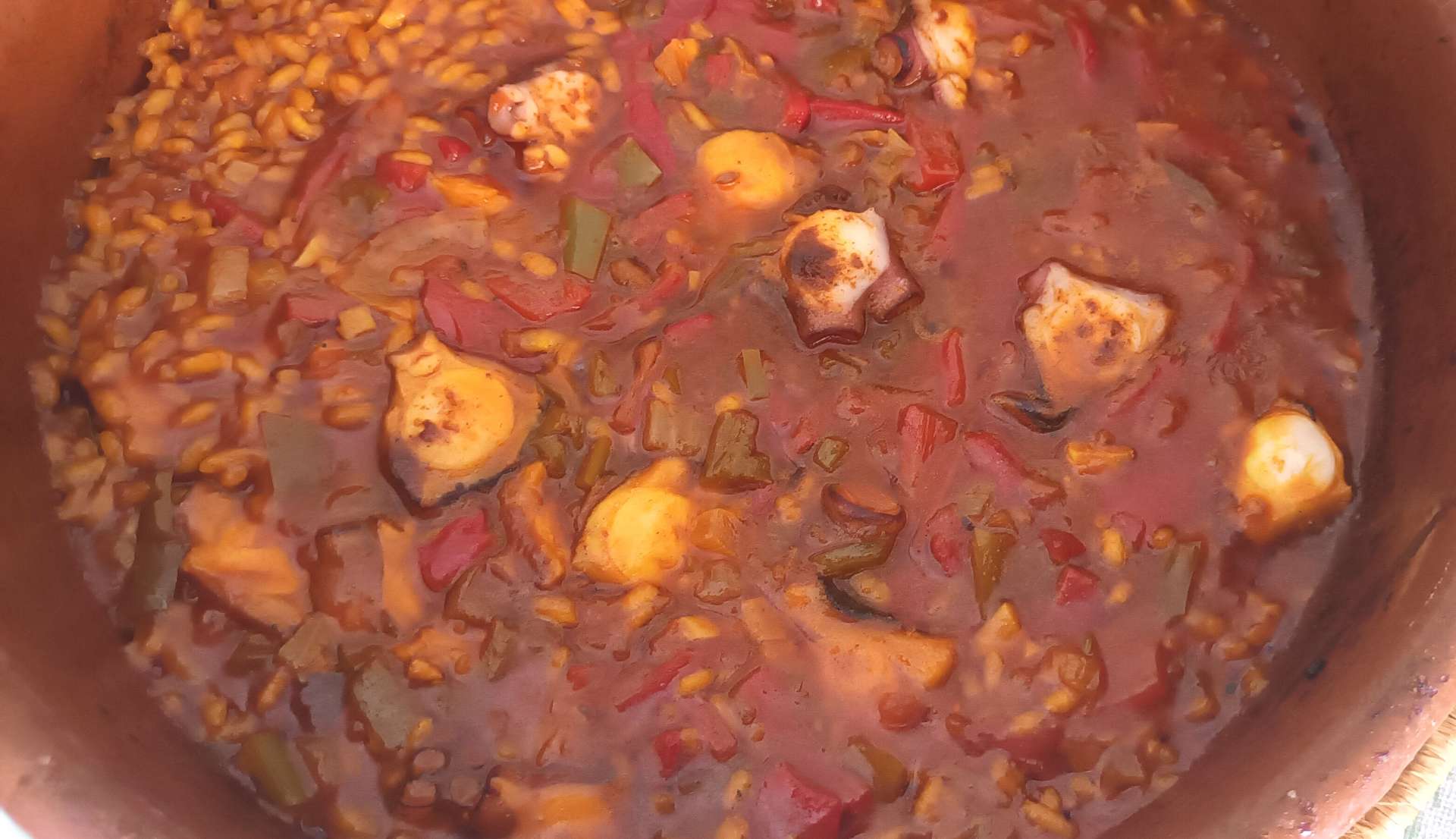 Echamos el arroz, un vasito por persona, removemos con el sofrito y añadimos el vino y el caldo, teniendo en cuenta que si lo queremos seco echaremos menos y si lo queremos caldoso un vasito más, lo ideal es cuatro vasos por cada uno de arroz. De todas formas al ir haciéndolo nos daremos cuenta de si necesitamos más líquido o no. Probamos de sal. Por último echamos el pulpo y lo integramos con el arroz. Listo…buenísimo.