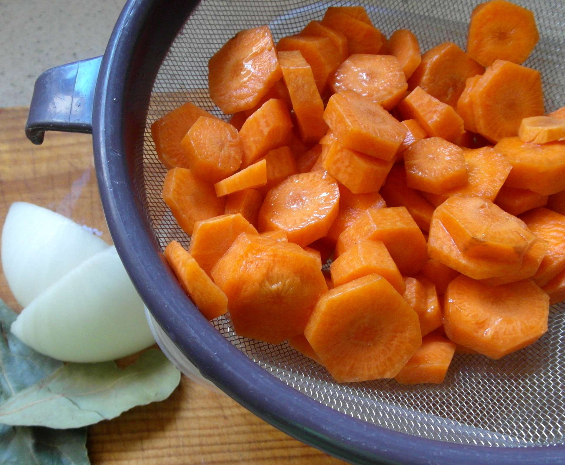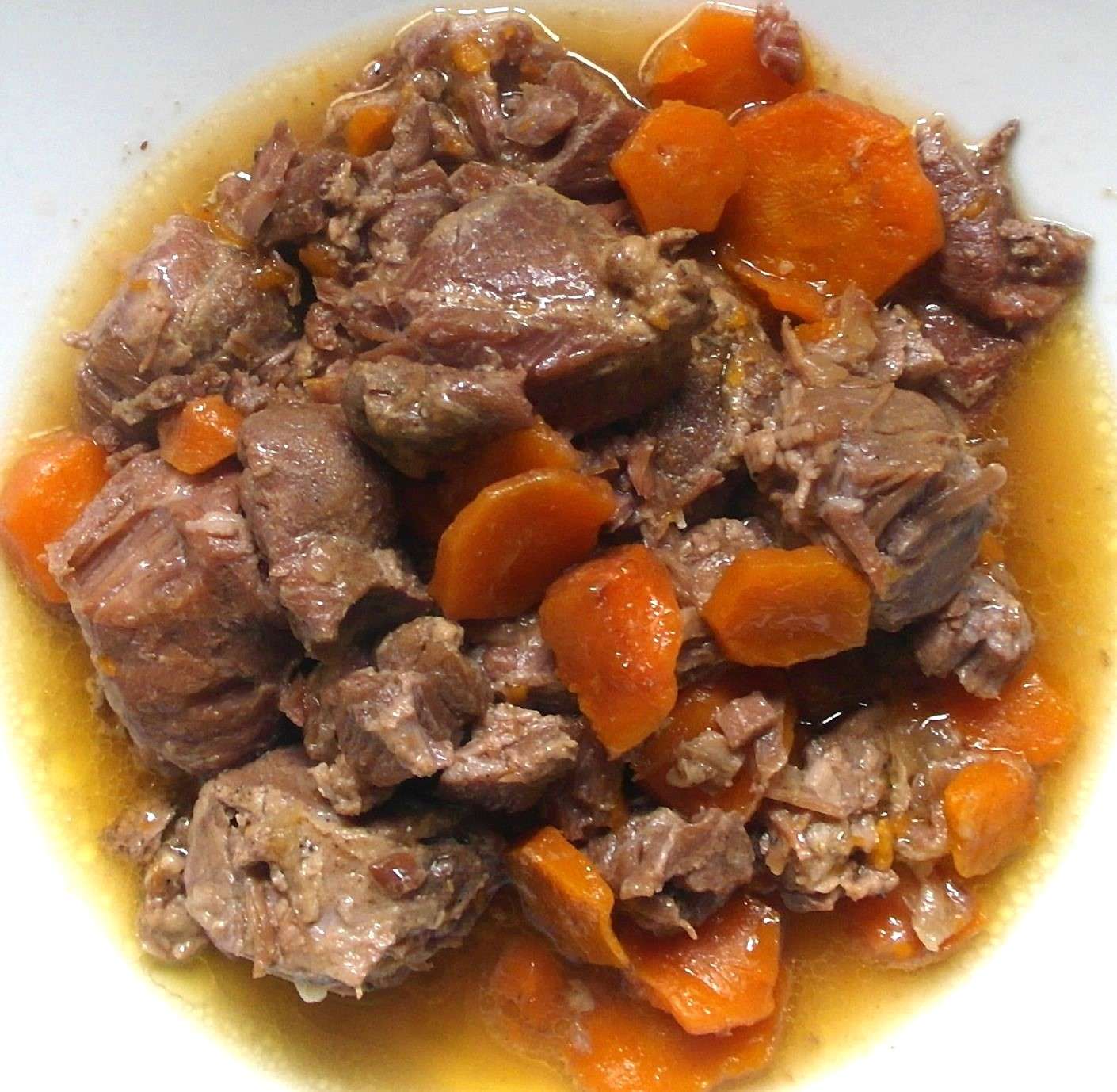 Echamos en el mismo aceite la cebolla picada y la sofreímos, añadimos el vino, el laurel, la carne, el caldo y las zanahorias peladas y cortadas en rodajas.