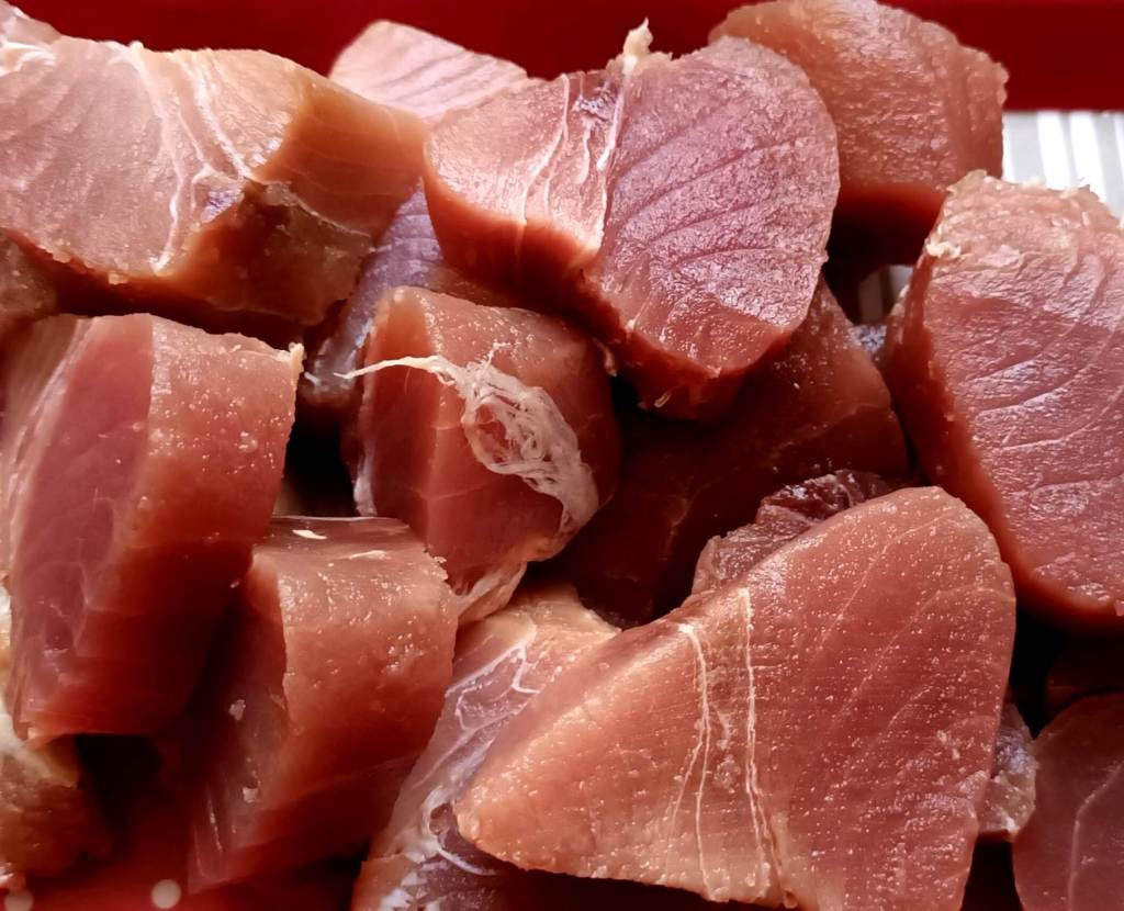 Se salpimenta el atún cortado en dados, se dora en una sartén o en una olla con aceite y se reserva.