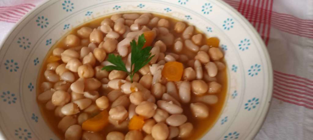 En una olla, mejor exprés o rápida, sofreímos en aceite la cebolla, el ajo y el pimiento picados. Añadimos la zanahoria pelada y cortada en rodajitas. Removemos y echamos las legumbres escurridas, las especies y sal. Cubrimos con agua y dejamos hacer hasta que estén tiernas
