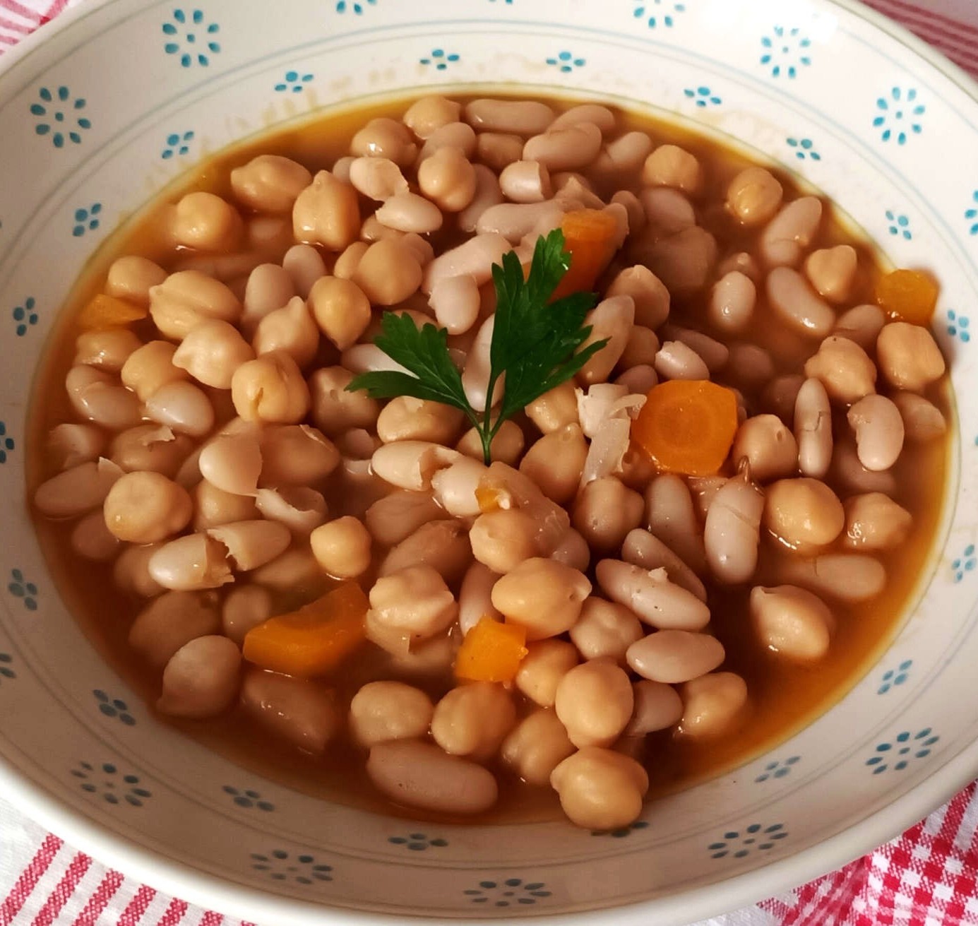 En una olla, mejor exprés o rápida, sofreímos en aceite la cebolla, el ajo y el pimiento picados. Añadimos la zanahoria pelada y cortada en rodajitas. Removemos y echamos las legumbres escurridas, las especies y sal. Cubrimos con agua y dejamos hacer hasta que estén tiernas