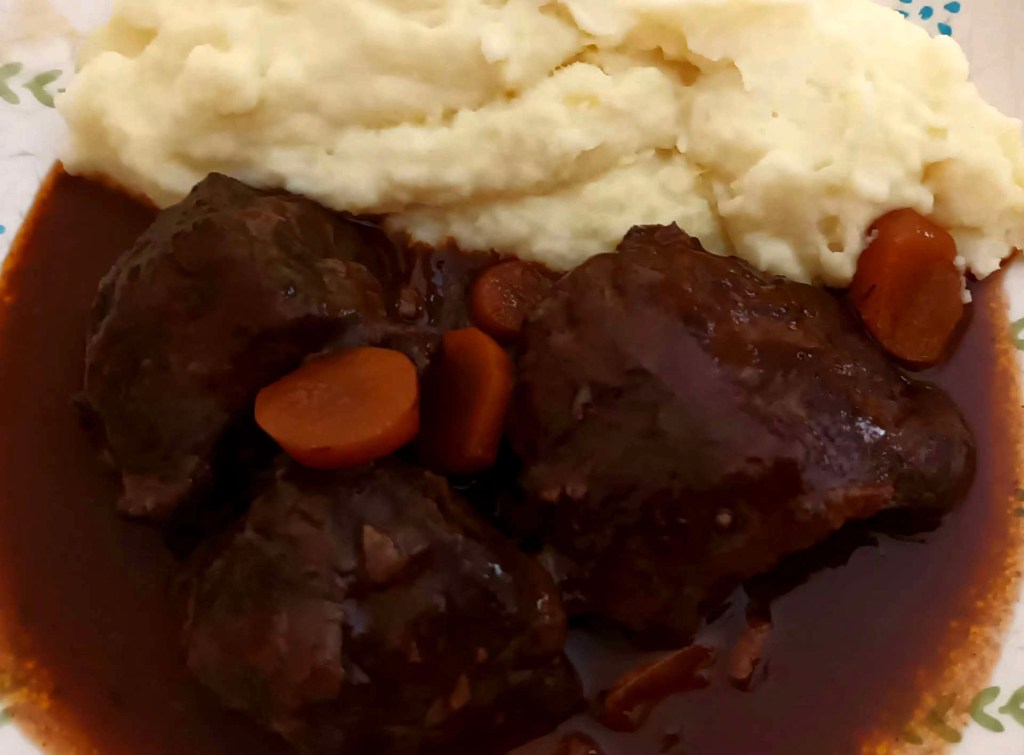 Añadimos las carrilleras y las doramos, echamos el vino y el caldo y, si es poco, un poco de agua. Las dejamos hacer hasta que estén tiernas, mejor en olla exprés o rápida. Por últimos añadimos el chocolate y dejamos que se derrita, y listo.