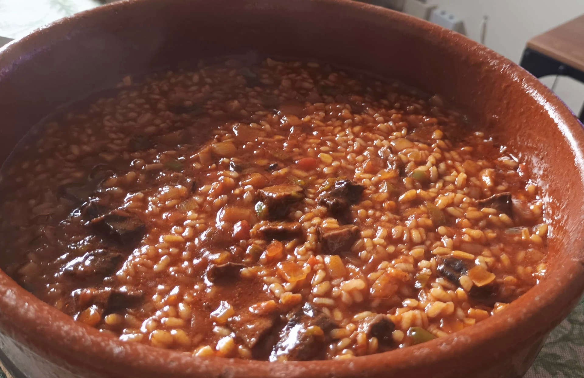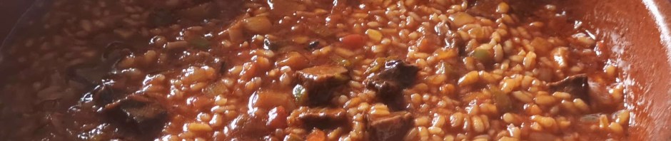 Hacemos un sofrito con el ajo, la cebolla, el pimiento y el tomate, todo muy picadito, añadimos una hoja de laurel. Echamos el arroz, un vasito por persona, rehogamos, añadimos el vino y el caldo y dejamos que se ponga tiuerno.