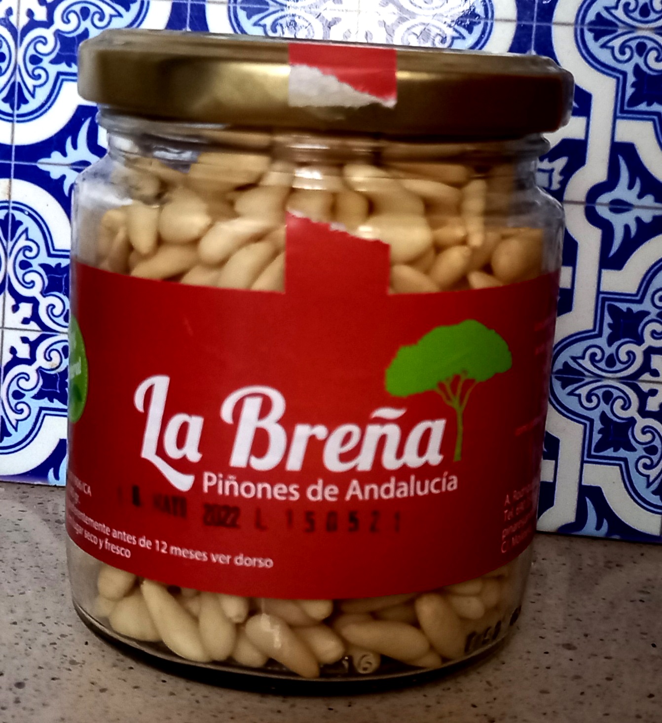 Pasamos la salsa por un pasapuré y la echamos en una olla normal, añadimos los piñones y hervimos un poco. Si la salsa está líquida la dejamos espesar.