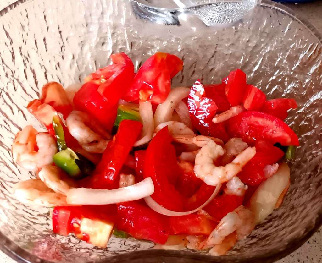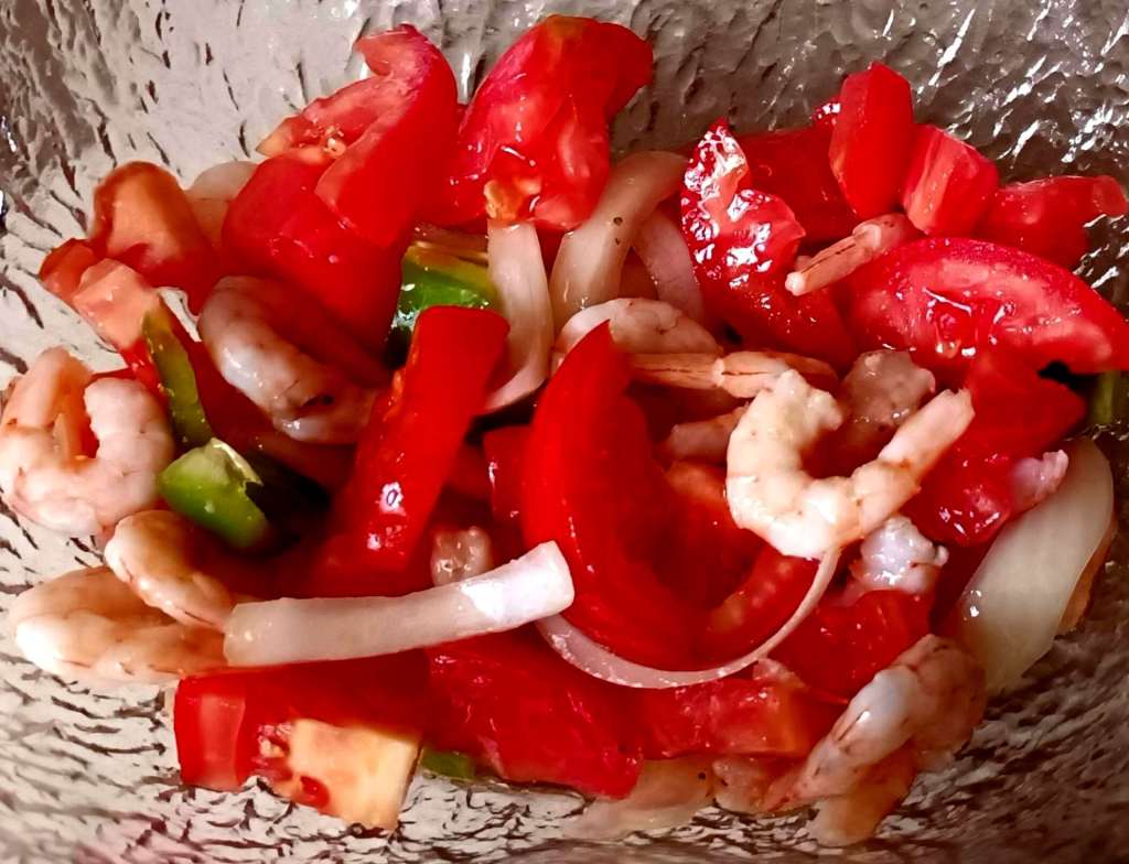Cortamos los tomates, el pimiento y la cebolla en trocitos y los echamos en un cuenco. Añadimos las gambas peladas y salamos a gusto y añadimos vinagre y aceite, en este orden.